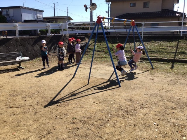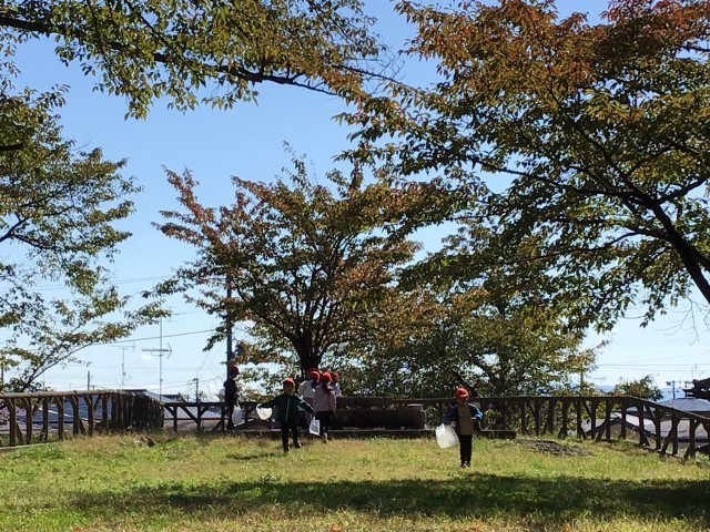 快晴の下、公園探検に行ってきました。子どもたちは、五感をフルに働かせ、夏に行った公園探検との違いをたくさん発見してきました。目的地に着くまでにも、たくさん実った柿やりんごの実に歓声を上げたり、黄色や赤に変わった葉を拾って見せ合ったりと、活発な1年生探検隊でした。