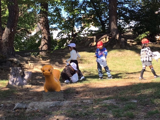 公園では、どんぐりや秋の草花を嬉しそうに「お土産袋」に入れていました。ご準備ありがとうございます。持ち帰った「たからもの」は、図工や生活科の作品作りなどに利用したいというお子さんもいました。