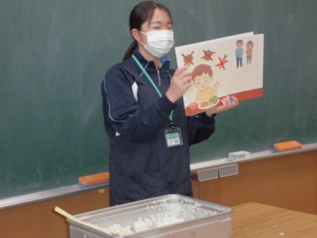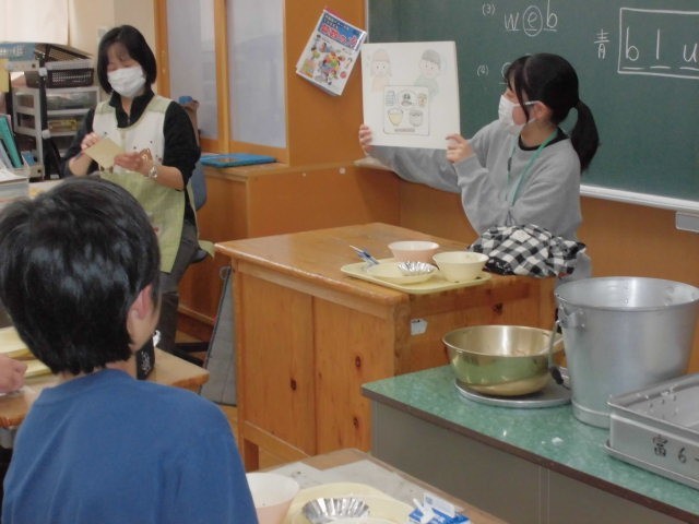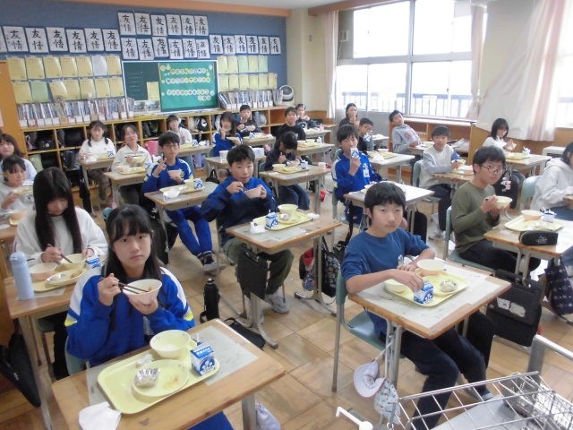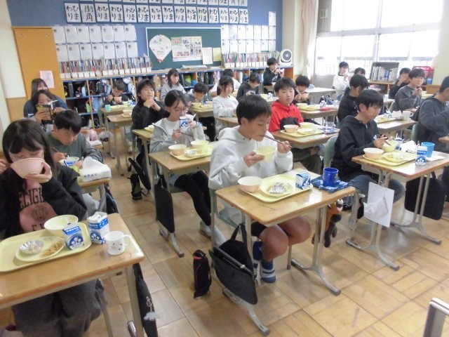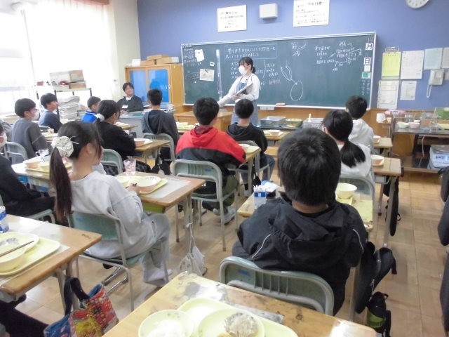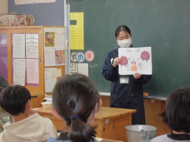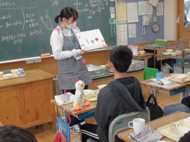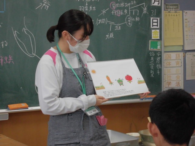 10月最後のメニューは、ごはん、豆腐とキノコの中華煮込み、切り干し大根サラダ、手づくり花シュウマイ、牛乳です。みんな大好きな中華メニュー、おいしくもりもりいただきました。栄養士教育実習の3名の学生さんも今日で無事実習が終わります。お昼の放送で、全校に向けて栄養についてお話いただき、6年生の教室では、紙芝居によるビタミンをはじめ栄養バランスについて食育紙芝居をやっていただきました。