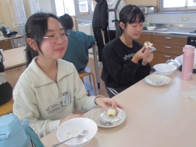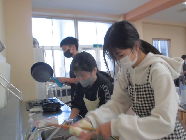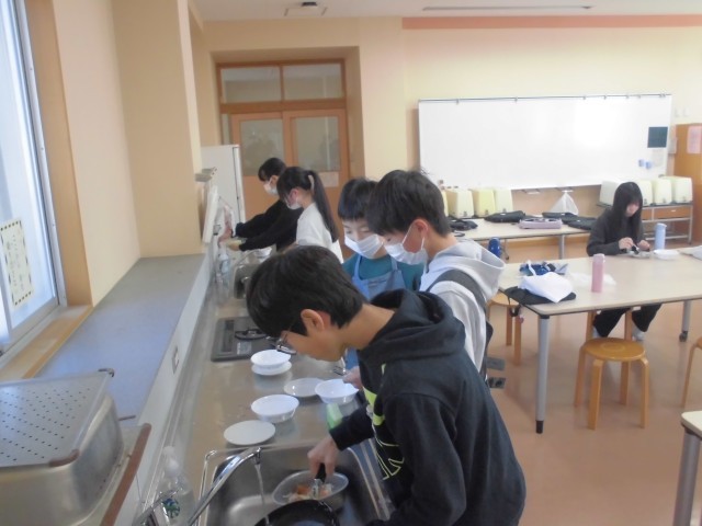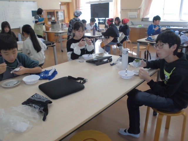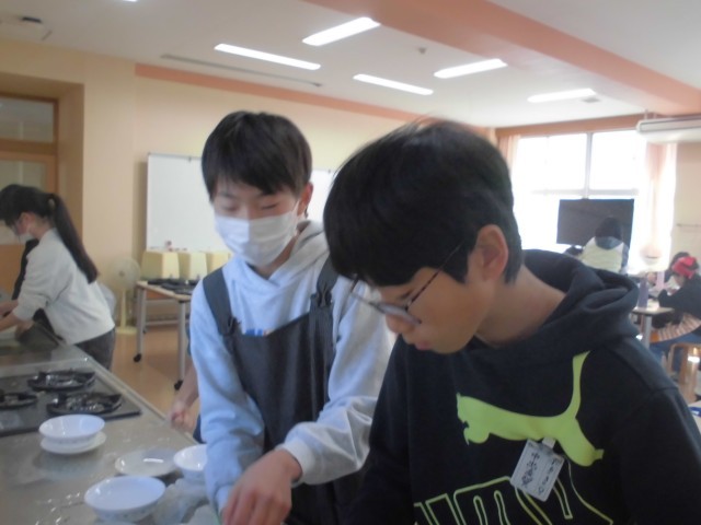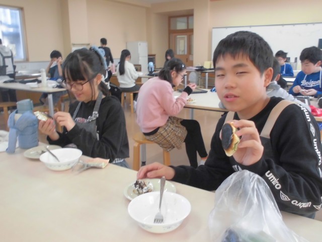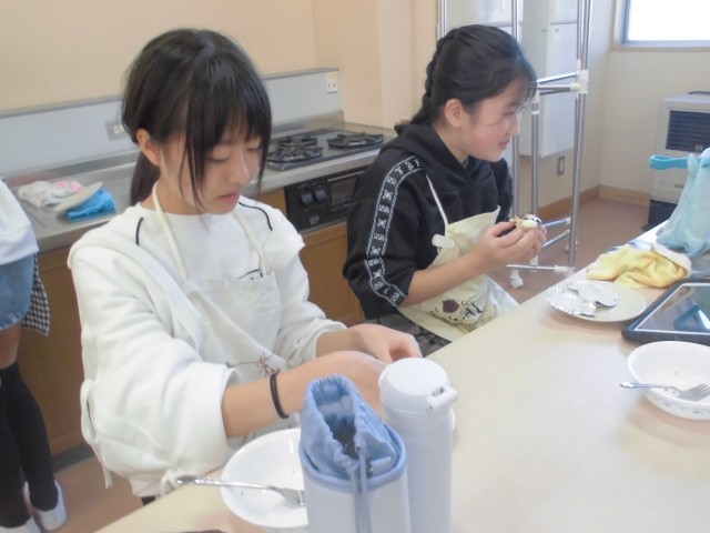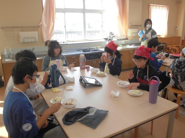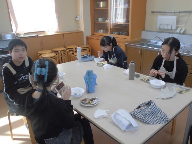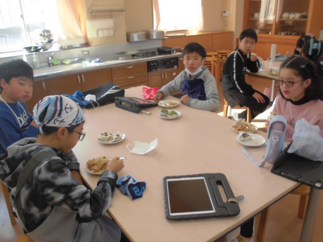 ジャーマンポテトと蒸しパン作りにチャレンジしていました。どのグループも協力し合って、包丁やガスコンロも安全に使って、調理できました。蒸しパンには、抹茶やナッツ、ココアなど、各々の好みや工夫を加え、その味に納得していました。家庭でも安全面には十分気を付けて、家族のみなさんにもご馳走できるといいですね。