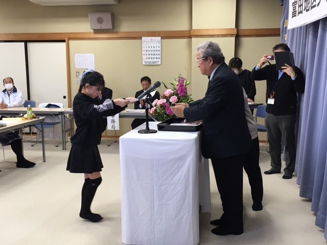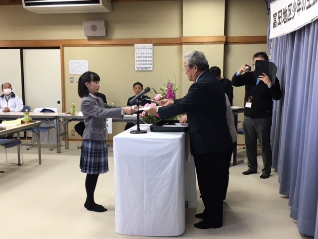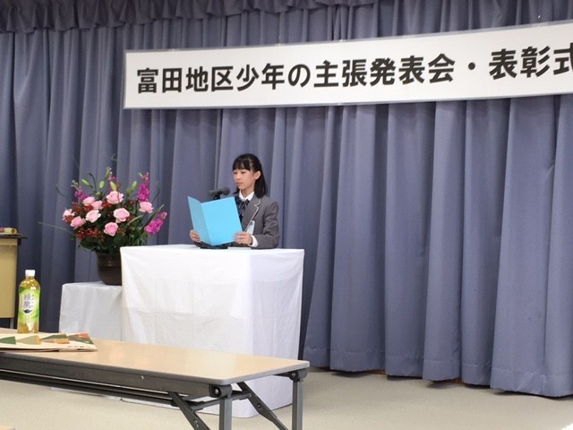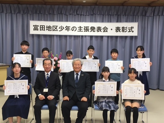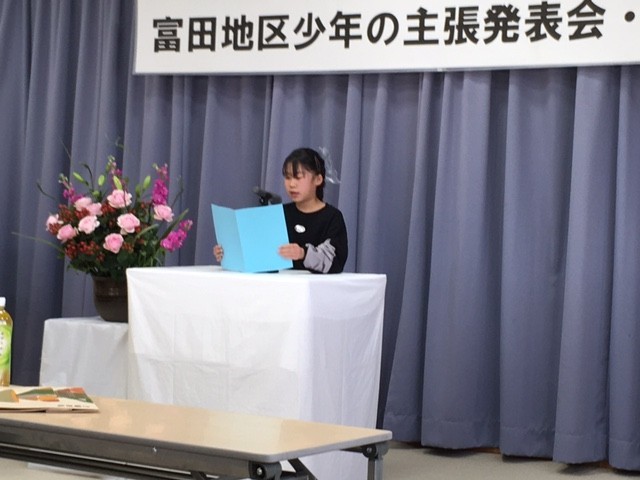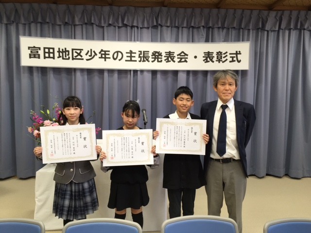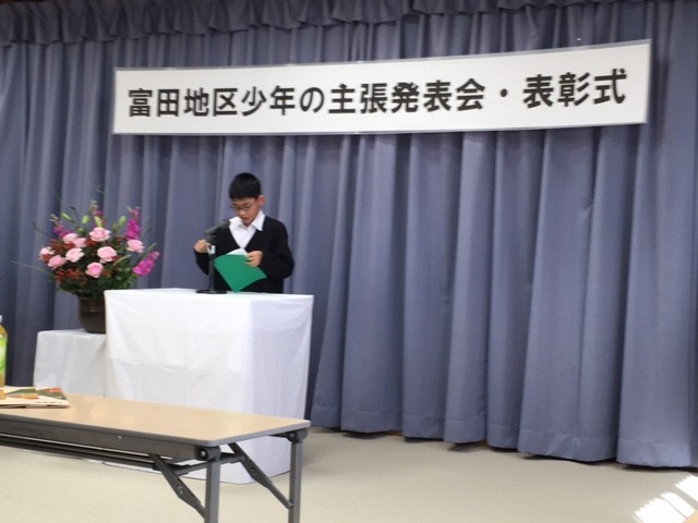 富田地区の明日を担う青少年の健やかな成長と永遠の郷土愛の助長を願うとともに、大会を通して家庭、学校、地域のよりよい環境づくりをめざし、標記、発表会が公民館において開催されました。本校からは100点の作品を出品し、5年生、6年生の3名の代表が発表いたしました。「思いやりの大切さ」、「自転車専用レーンの整備拡充による安全安心」、「みんなに優しい世界や社会づくり」について、堂々と丁寧に、主張発表することができました。「学びを行動に」、よりよい未来づくりに向けて、各々のすばらしい思いや願い、アイデアが実現できるよう、地域が一丸となって応援していきたいと考えます。