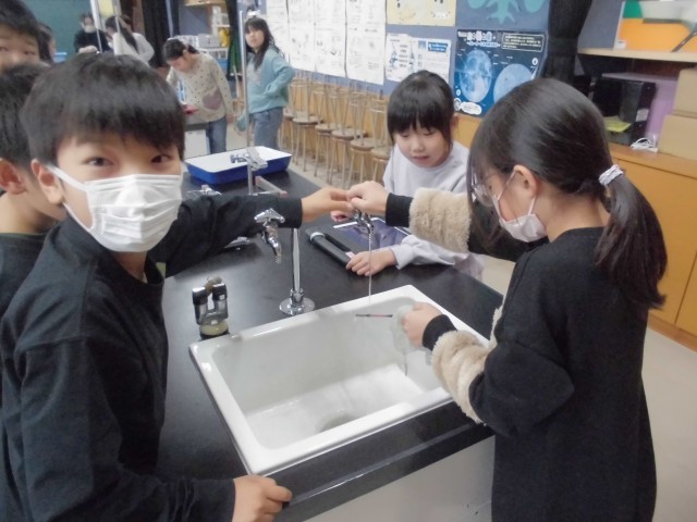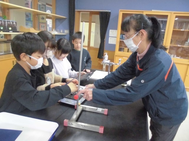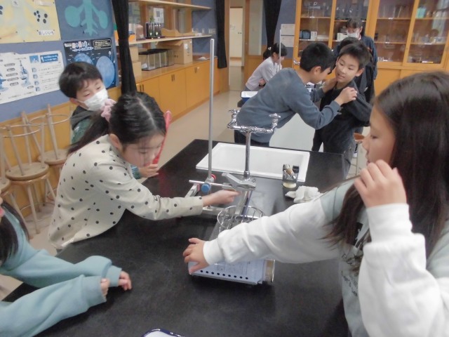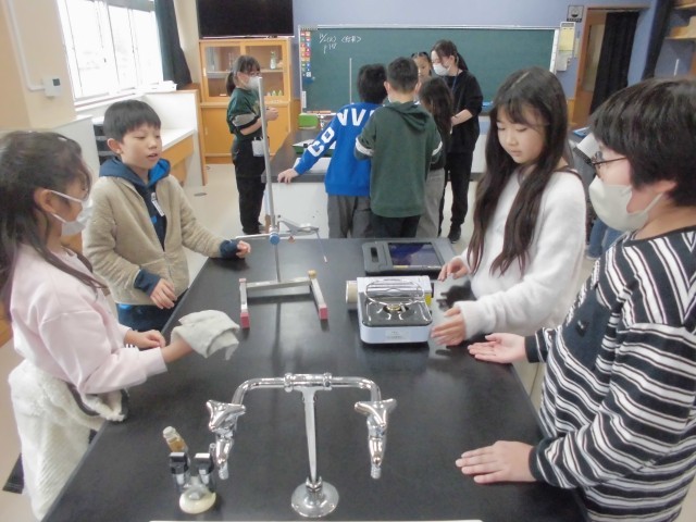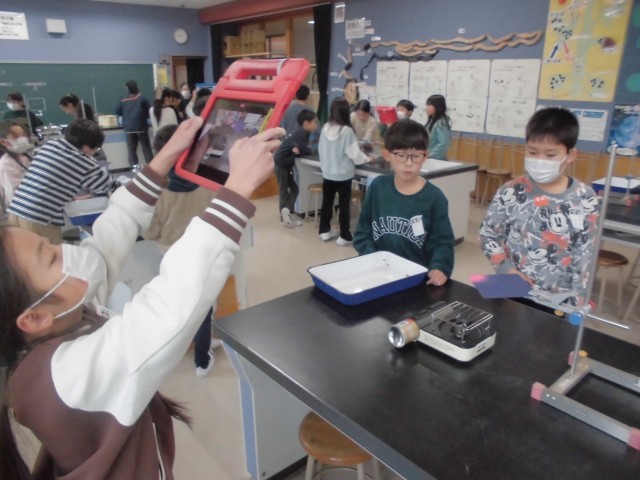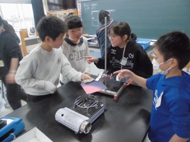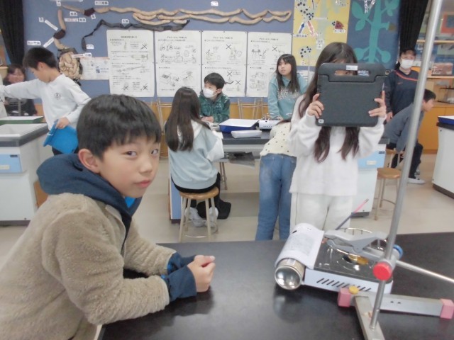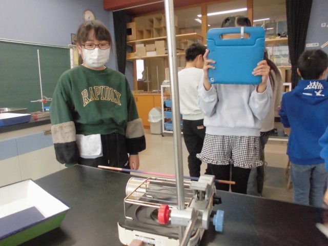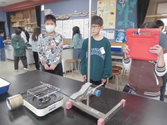 金属のぼうや板に、熱さで反応するインクをぬって、コンロで熱し、熱の伝わり方を調べる実験観察です。グループでやけどをしないように、安全に気をつけながら、実験に取り組むことができました。熱によるインクの色の変化をタブレット端末で録画記録することもできました。実験の結果から金ぞくのあたたまり方の特徴をしっかり考察してほしいと思います。