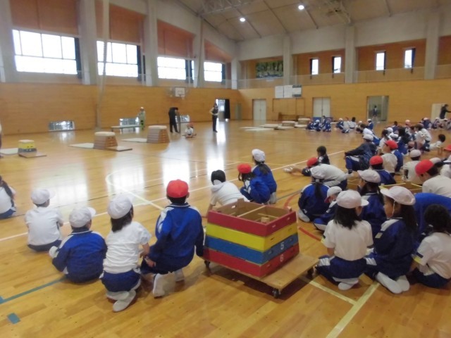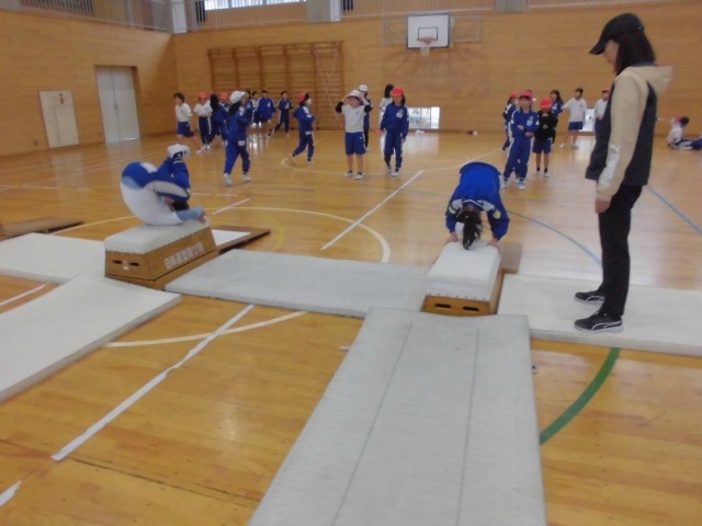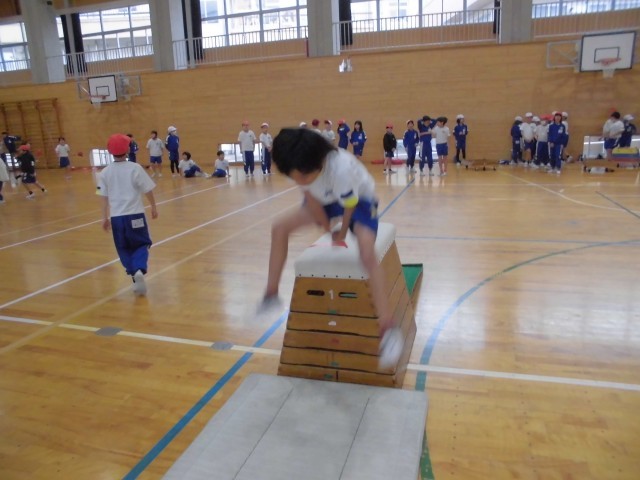 3年生が、跳び箱運動です。今日は、開脚跳びと台上前転にチャレンジしています。こわがらず「踏み切りから着手、着地」の感覚を身に着けることが大切です。跳び箱の高さを選べる場の設定や先生方が補助につくなど安全面に配慮したことにより、子どもたちは安心して、意欲的に練習に取り組むことができました。片付けもみんなで協力し合って、手際よくできました。