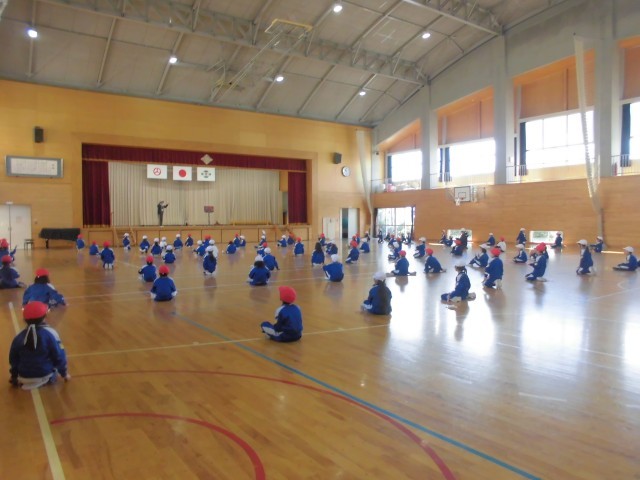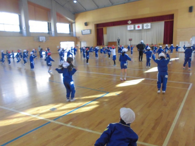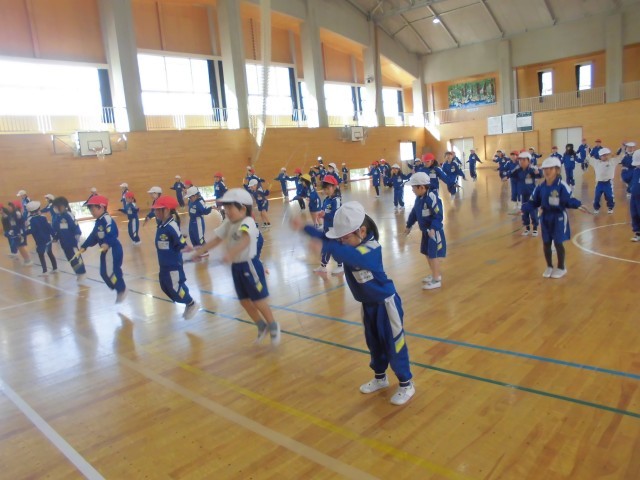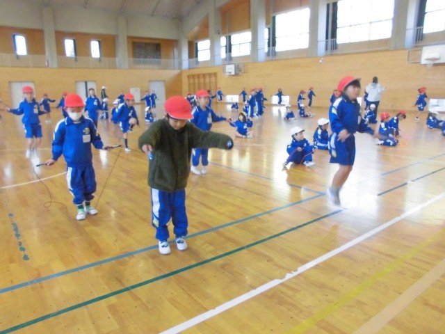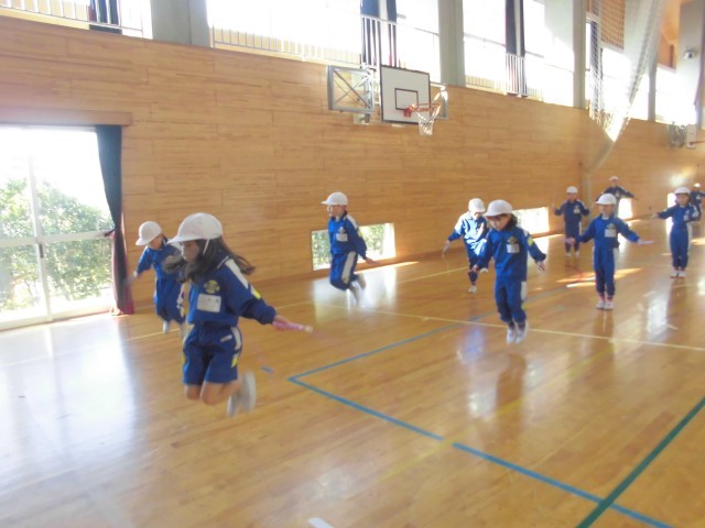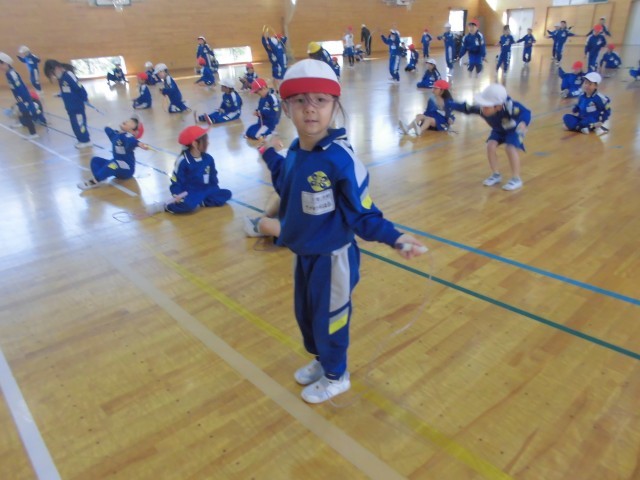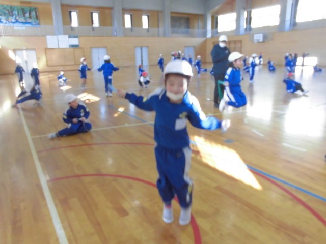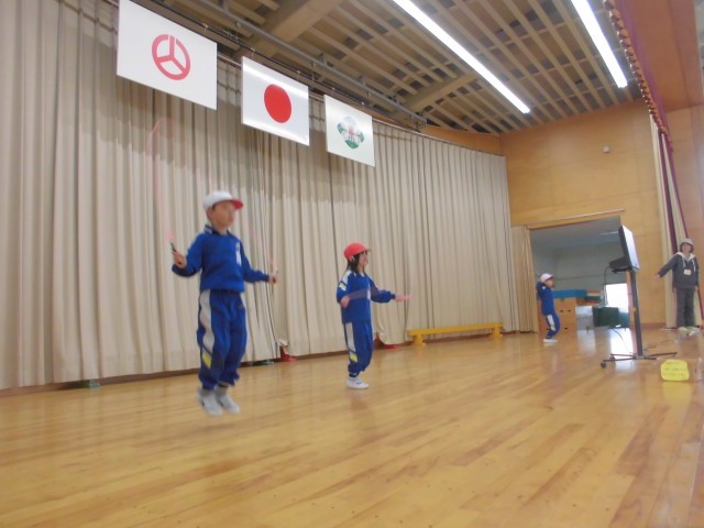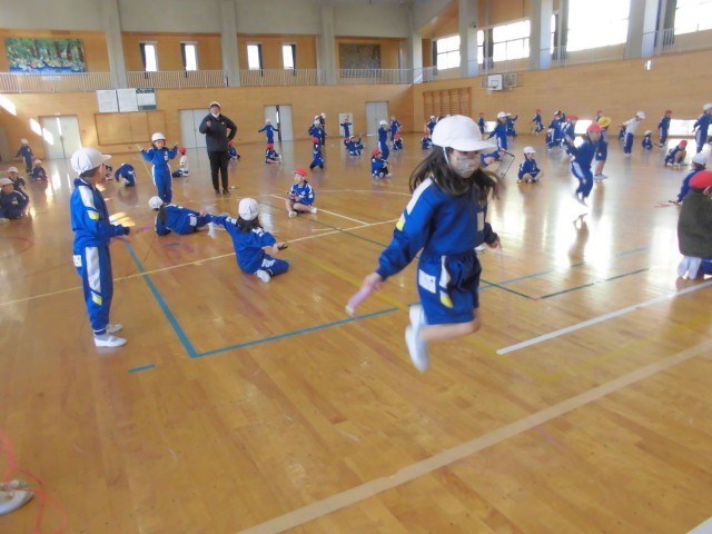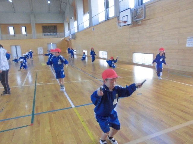 1年生のなわとび運動の授業です。なわとびを初めて跳ぶ子も多いようです。「両足をそろえてジャンプすること」、「ジャンプに合わせて、リズムよくなわを回すこと」など、ポイントを意識して練習できるよう働きかけています。なわを上手く回せない時は、片手で回す練習をすると効果的です。冬場の体力づくりのために、毎日、続けて取り組んでほしいと思います。