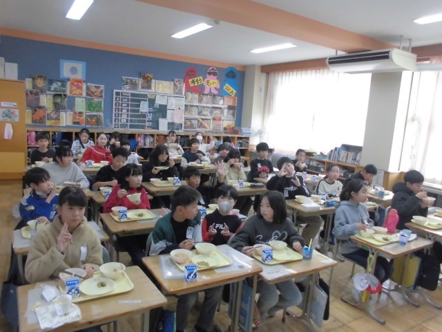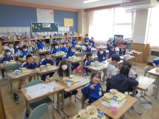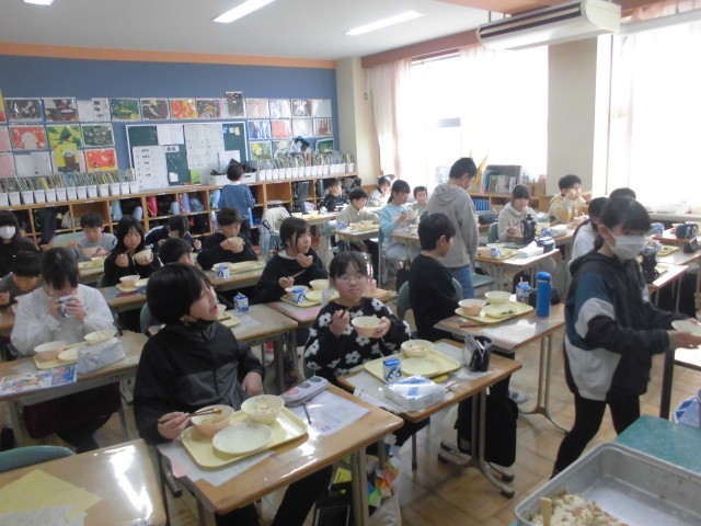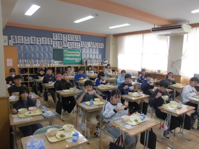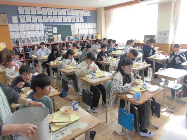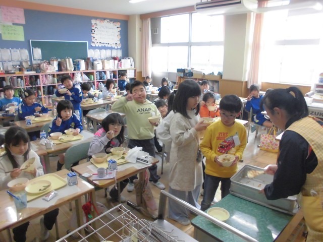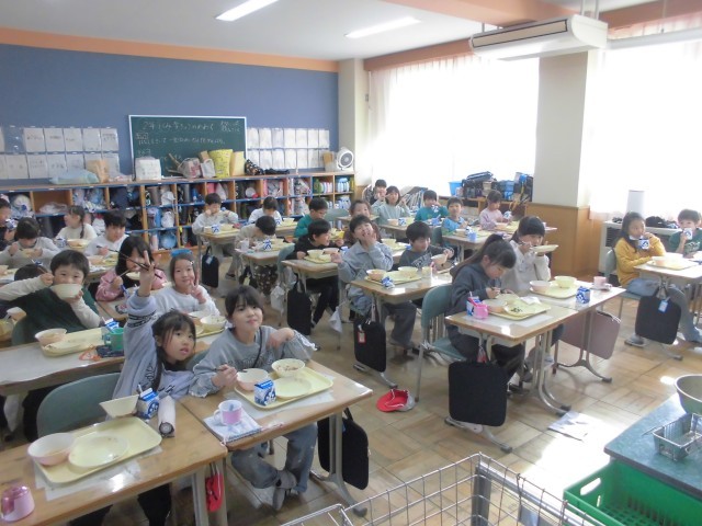 本日の献立は、鶏ごぼうご飯、石狩汁、のりあえ、牛乳です。リクエストメニュー週間なので、リクエストはどれなのかといえば、なんと「のりあえ」ということです。ホウレン草とのりを醤油みりんであえたシンプルなおかずですが、意外にも子どもたちには大人気ということです。寒さにもってこいの石狩汁は、鮭の大きな切り身と野菜がたっぷりで、鶏ごぼうご飯も鶏肉たっぷりで、どちらもおかわり続出でした。