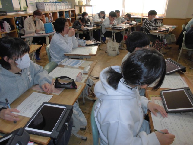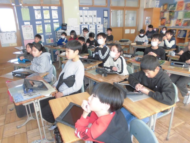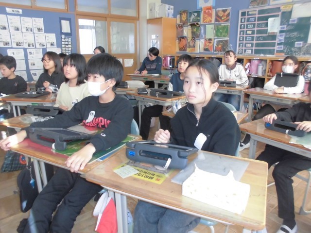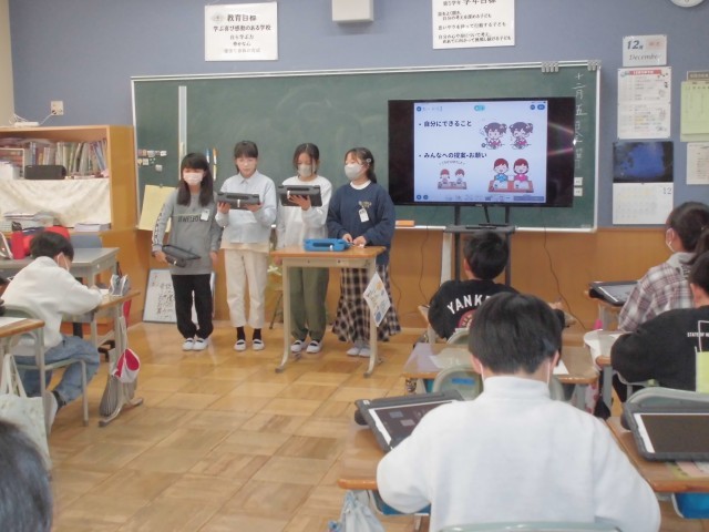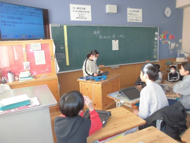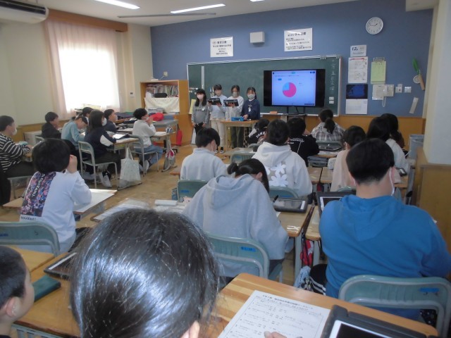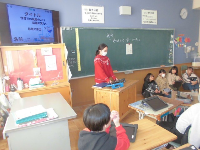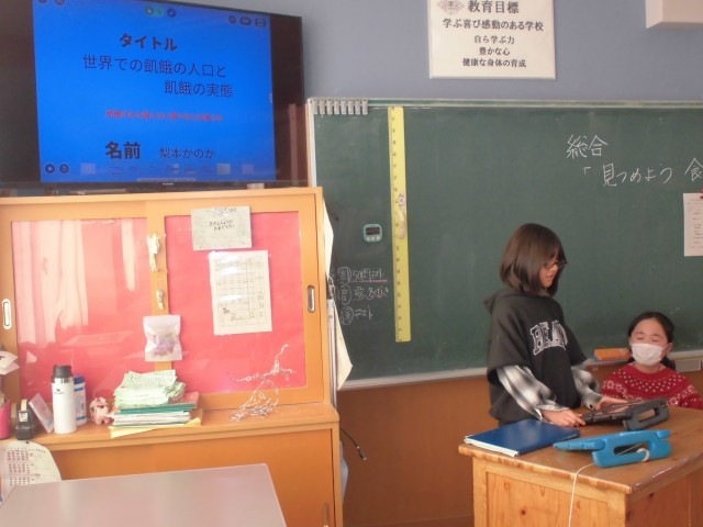 「食品ロス」「食品の値上がり」「世界における飢餓」「気候や海の環境と食の関係」「日本食の魅力」などの課題やテーマについて探求してきたことをタブレット端末を活用し、プレゼン資料にまとめ、聞き手に分かりやすく、一人一人発表することができました。大切なことをメモしながら聞く姿も立派でありました。課題設定、情報の収集、分析、まとめ、感想までの問題解決型の学習の流れに沿ってしっかり取り組んできたことが分かります。これからも、この学びを生かし様々な疑問や課題解決のための探究にチャレンジしてほしいと思います。