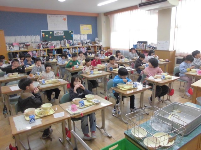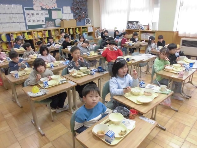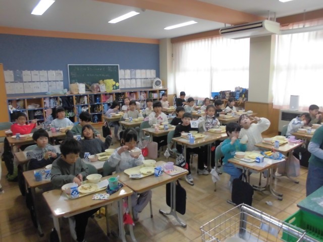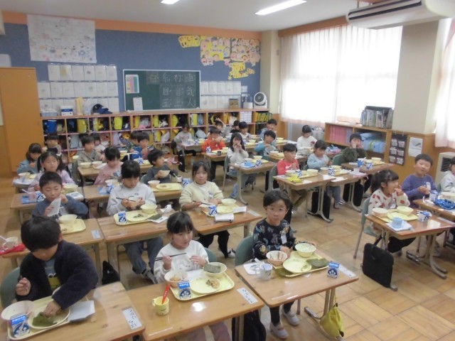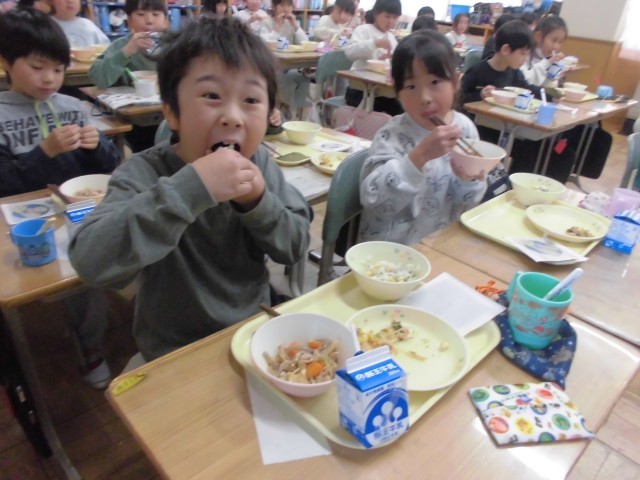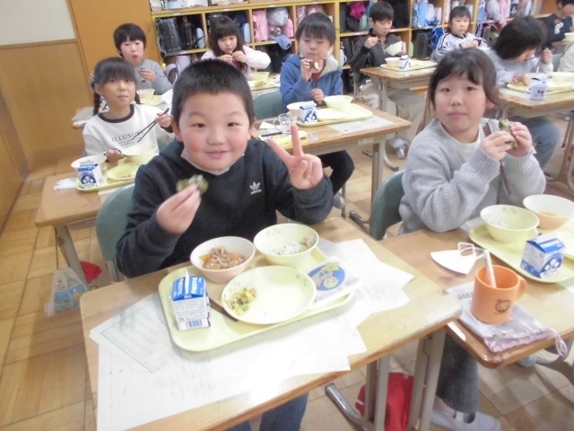 今日の献立は、大豆入り菜めし、大根と豚肉の煮物、小松菜とツナの和えもの、牛乳、手巻き用の「とみたん」のりです。みんな菜めしをのりに上手にくるんでおいしくいただくことができました。今年度2回目のとみたんのりの登場に子どもたちは喜んでおりました。