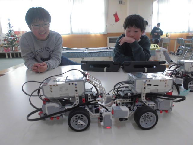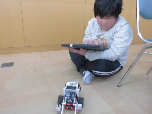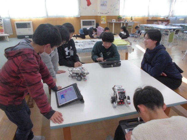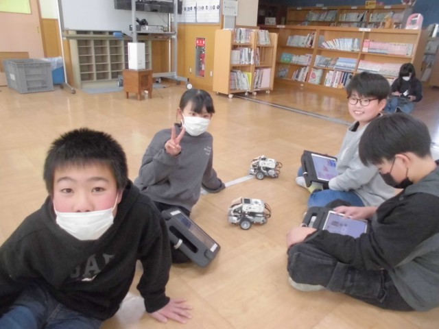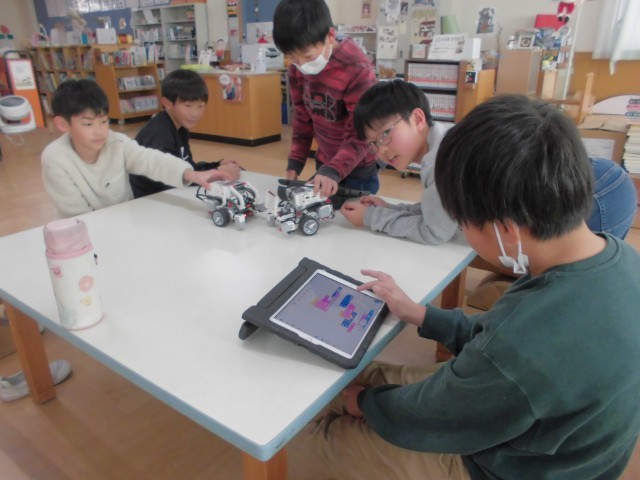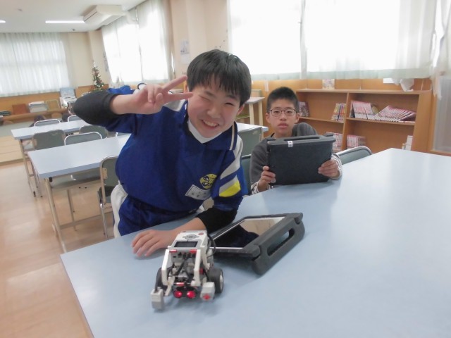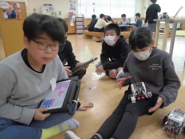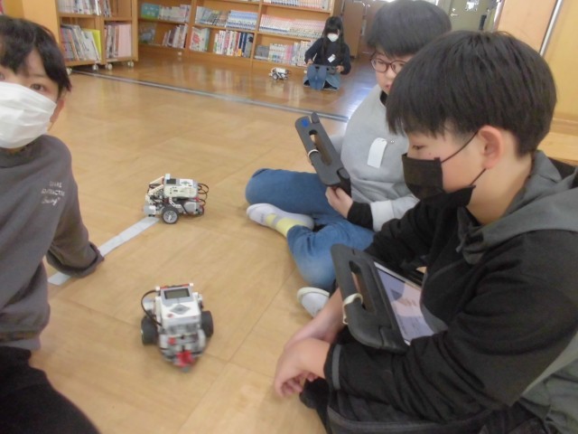5年生が「mBot(エムボット)」をプログラミング指令で動かしていました。プログラミング言語「スクラッチ」による言語ブロックをタブレット上で組み合わせ、mBotを遠隔操作します。なかなか思い描く動きにならなかったり、予想外の動きに驚いたりと、子どもたちは仲間と試行錯誤、トライアンドエラーを繰り返しながら、取り組んでいました。