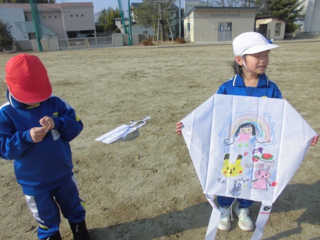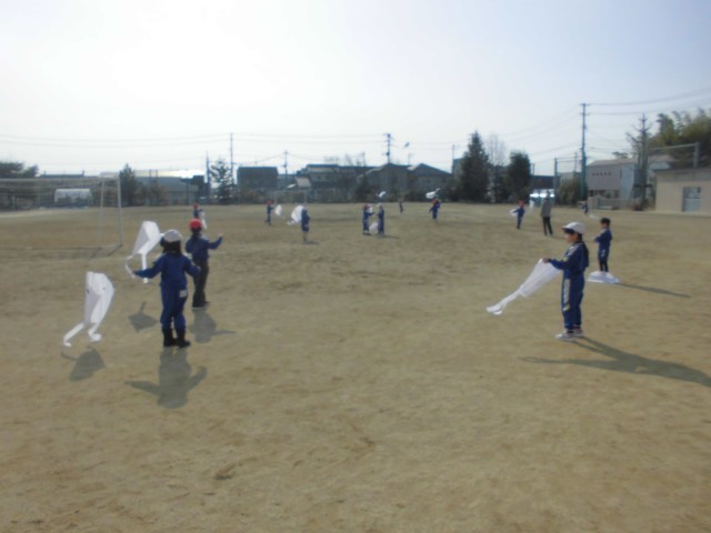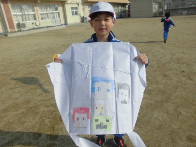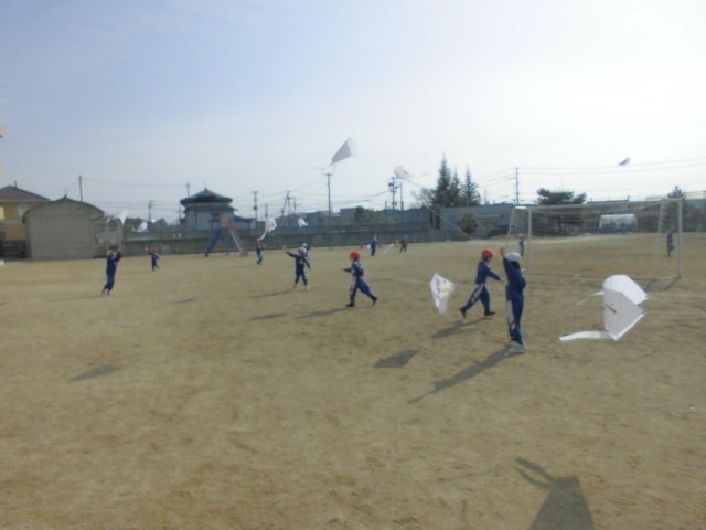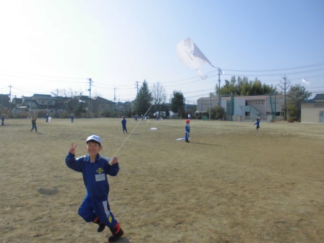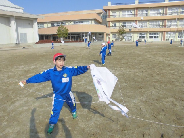 1月といえば凧あげ遊び、1年生が生活科で作った凧をあげています。今日は昨日までの厳しい寒さがやわらぎ、温かく穏やかで、風もほどよく、凧あげには絶好のコンデションでした。子どもたちは、自分で描いた絵入りのオリジナル凧を糸の長さを調節し、試行錯誤しながら、上手にあげることができました。