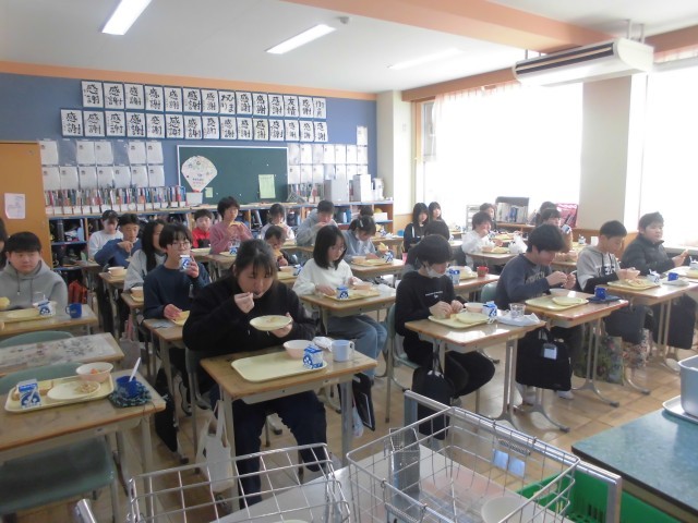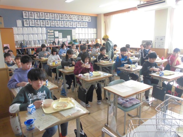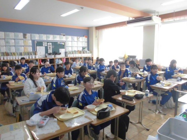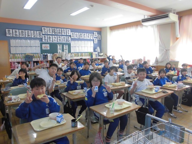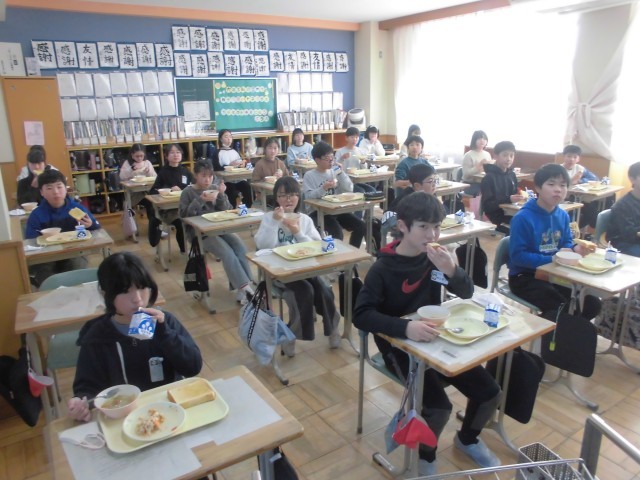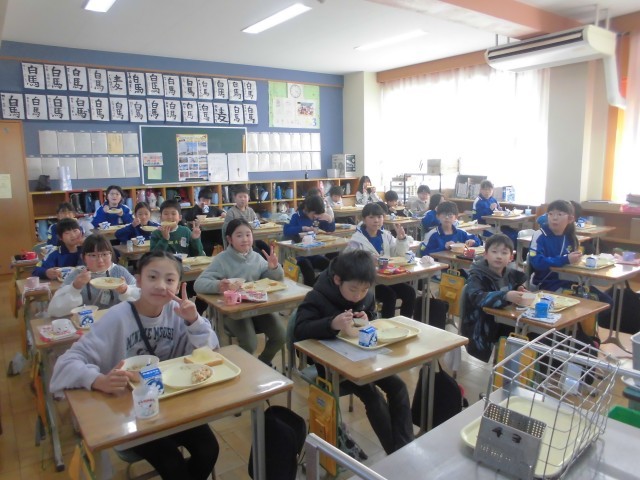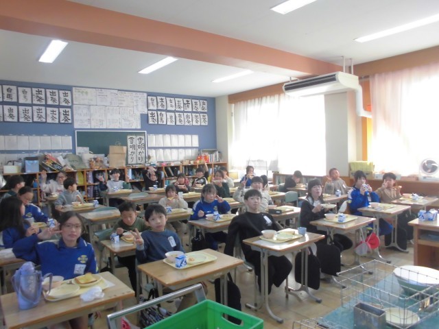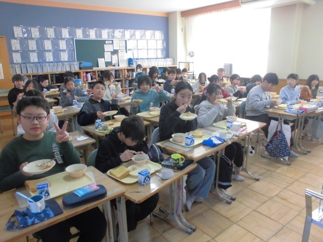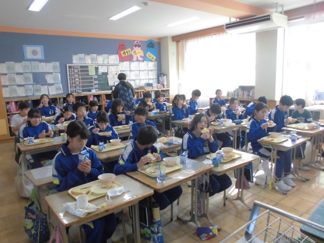 今日の献立は、ハニートースト、豆サラダ、ポトフ、牛乳です。フランス風のポトフの野菜たっぷりの甘味とハニートーストのハーモニーがおいしさをいっそう引き立てていました。上学年の子どもたちもみなニコニコ笑顔で、もりもり食べていました。