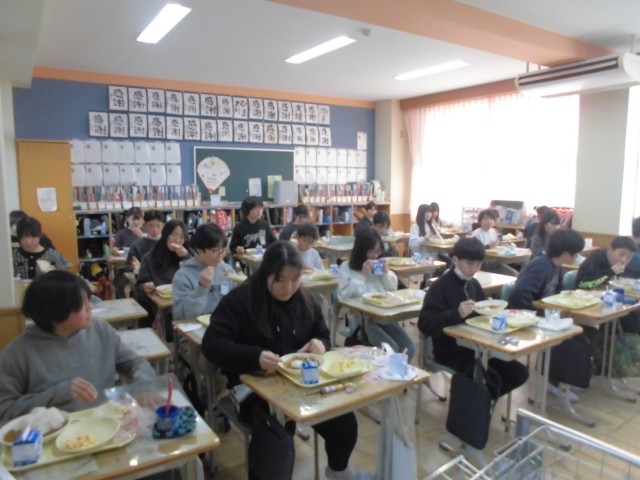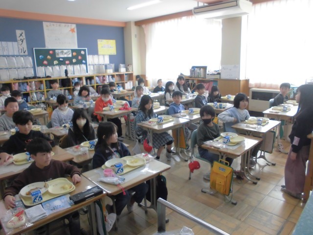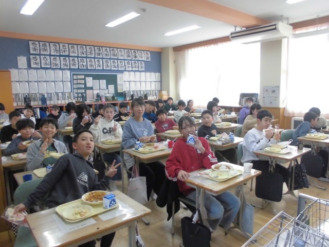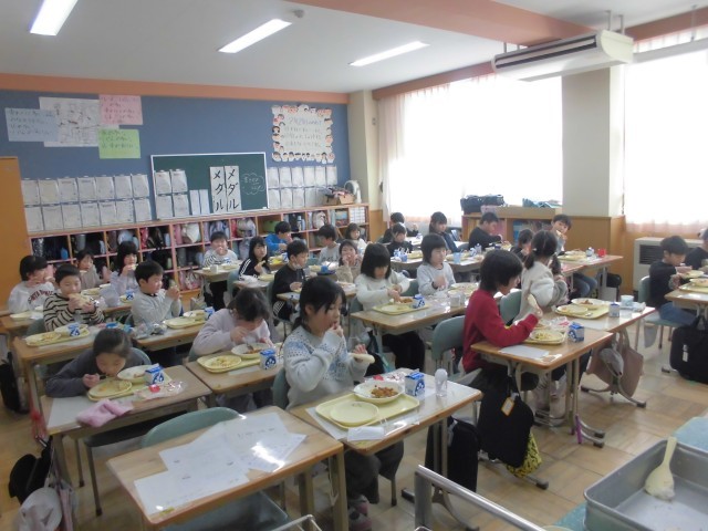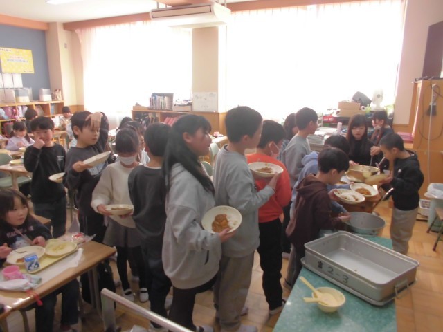 今日の献立は、6年生が家庭科の授業で考案したNPC(ナン、ポテト、キャロット)カレーライス、麦ごはん、ナン、もやしとチーズのサラダ、牛乳です。もちろん子どもたちは、カレーが大好きで、おかわり行列ができていました。かぜやインフルエンザに負けないように、しっかり食べましょう。