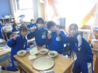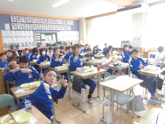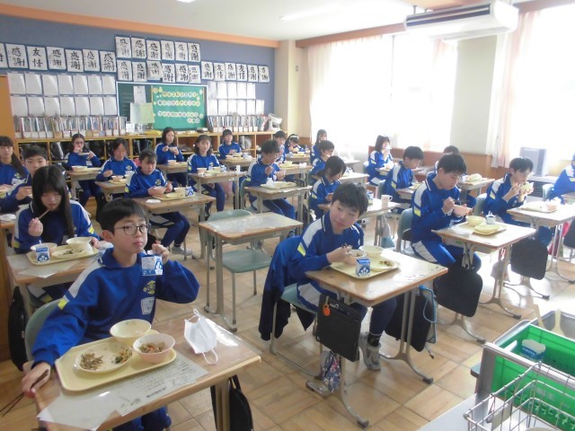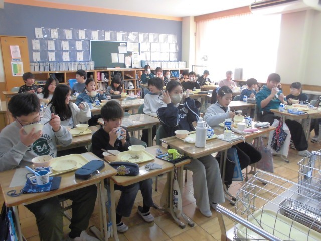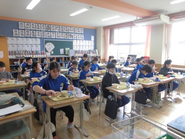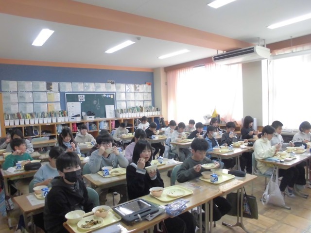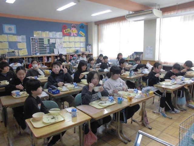 今日の献立は、郡山市と姉妹都市である奈良(市)の郷土料理「吉野煮」、白菜ののり和え、小魚とショウガの佃煮、麦ごはん、牛乳です。吉野煮は、奈良の吉野地方の特産品「くず粉」でとろみをつけた煮物であります。鶏肉と根菜がたっぷり入っていて、あつあつで、子どもたちは、よく味わいながらおいしくいただいておりました。小魚とショウガの佃煮もご飯にかけて、もりもりいただいていました。