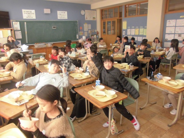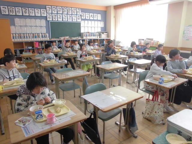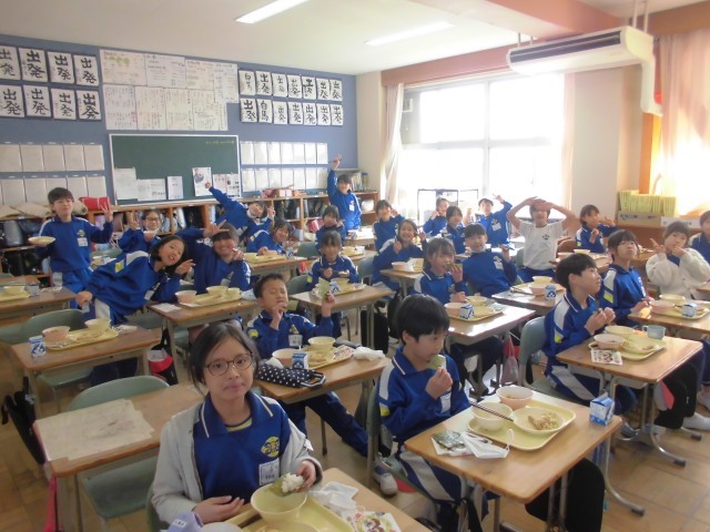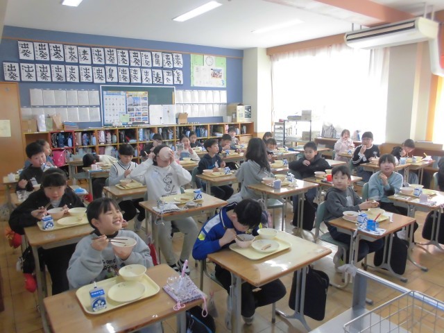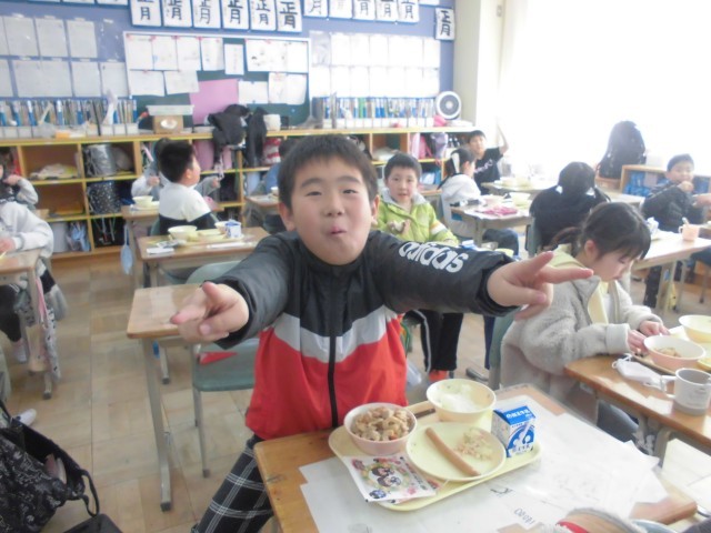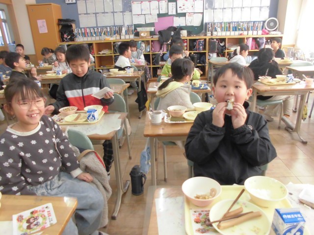 今日は節分、給食も「恵方巻(ツナ和え、ソーセージ、海苔、酢飯)、ざく煮、牛乳です。子どもたちは、上手に恵方巻をつくり今年の恵方「南南東」に向かって、おいしそうに食べておりました。午前中に、全学年学力テストがあり、頭も疲れ、おなかもペコペコだったようです。