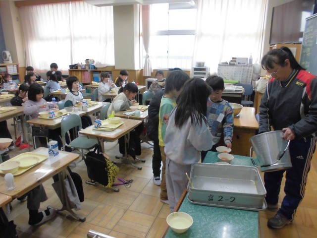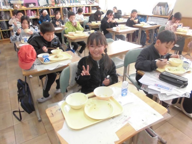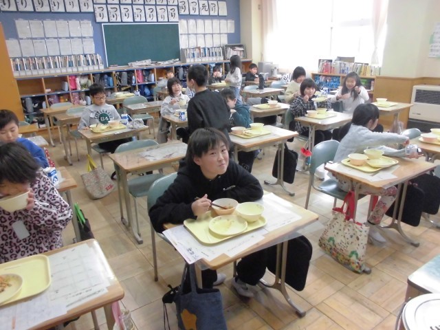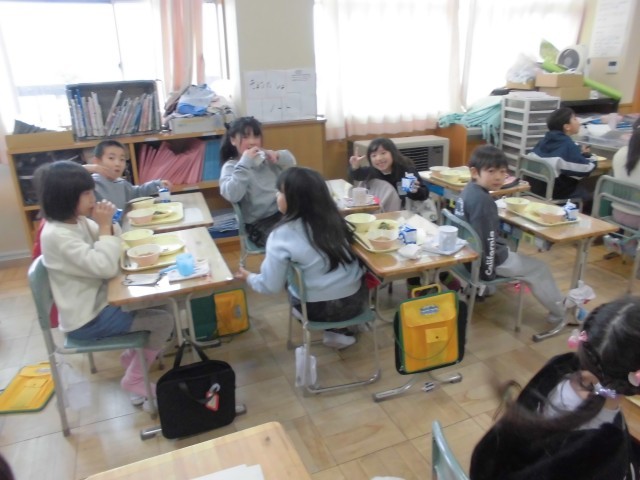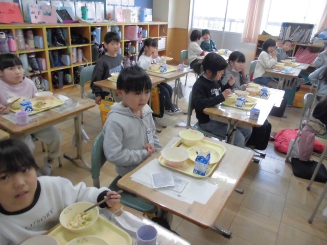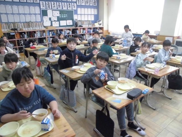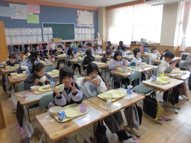 2月最初の「午(うま)」の日に、五穀豊穣や家内安全を祈る習わしにちなんで、本日のメニューは、こぎつねご飯、たぬき汁、小松菜のごま和え、牛乳でした。こぎつねご飯は鶏のひき肉と「油揚あげ」のまぜご飯、たぬき汁は、「こんにゃく」と根菜とさつま揚げがたっぷり入ったしょうゆベースの汁物です。みんなおいしそうにもりもりいただいていました。