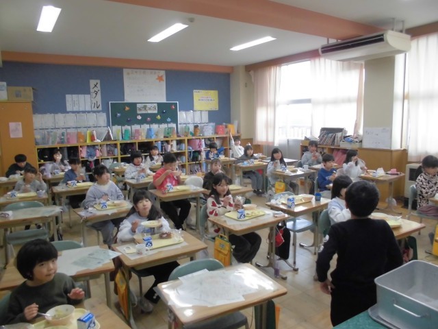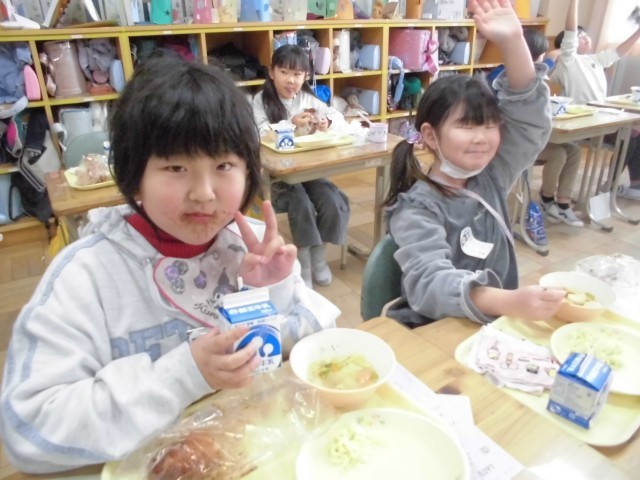 今日の献立は、ココア揚げパン、カッテージチーズサラダ、チキンポトフ、牛乳です。子どもたちからのリクエストが大変多かったココア揚げパンということで、みんな給食になるのを楽しみにしていたようです。口のまわりをココアで真っ黒にしながら、おいしそうに食べている姿が微笑ましく感じました。
