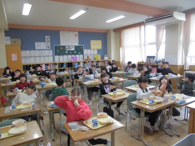 今日の給食は、肉だんごのトマトスープ、ドッグパン、フルーツクリームあえ、大豆小魚、牛乳です。子どもたちは、ドッグパンにフルーツクリームをはさんで、フルーツサンドにしておいしそうに食べています。肉だんごたっぷりのトマトスープも酸味が効いていて、フルーツサンドにぴったりです。