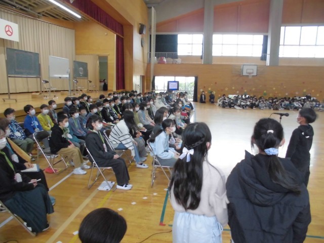 来週はもう3月です。6年生85名の卒業を祝うとともに、卒業生と下級生が互いに感謝の気持ちを伝え合う「ありがとう6年生の会」を開催しました。1~5年生は、実行委員会を中心に会場や校舎内の飾りつけ、招待状や感謝のメダル、メッセージカードの作成などの準備作業と、本日発表する学年ごとの出し物の練習準備に取り組んできました。