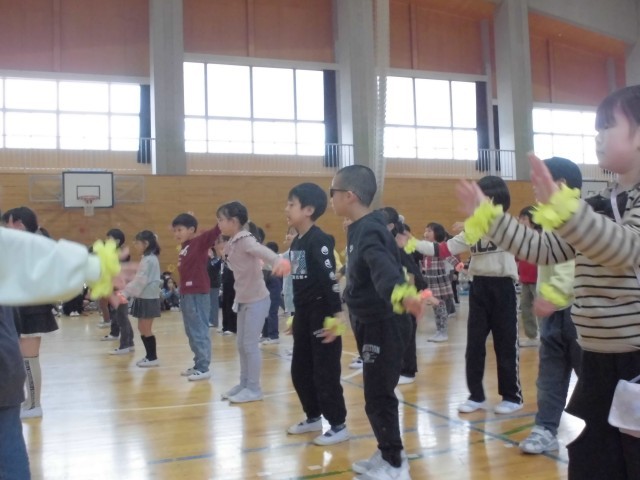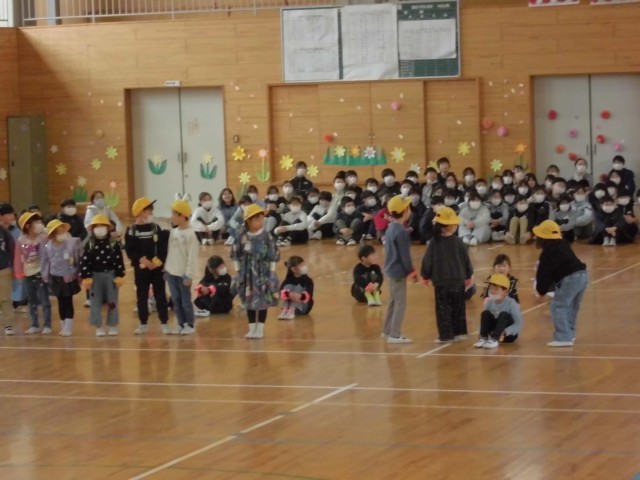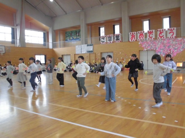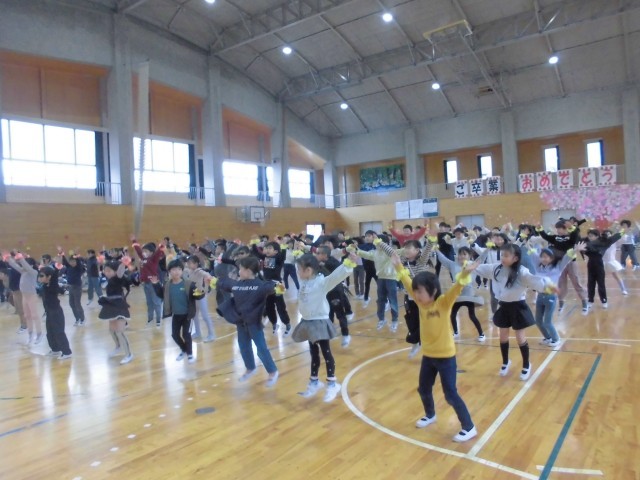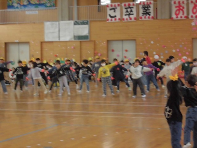 6年生が1年生と手をつないで入場し、メダルをかけてもらいます。全校児童で校歌を三番まで合唱しました。トップバッターは1年生の発表です。「可愛いだけじゃないライブ・卒業スペシャル」と題し、ダンスと歌、6年担任福笑いで、大変盛り上がりました。次は2年生の発表です。「6年生はわたしたちのカリスマックス そしてここはダンスホール」と題し、ダンスと歌とメッセージでまたまた盛り上がりました。
