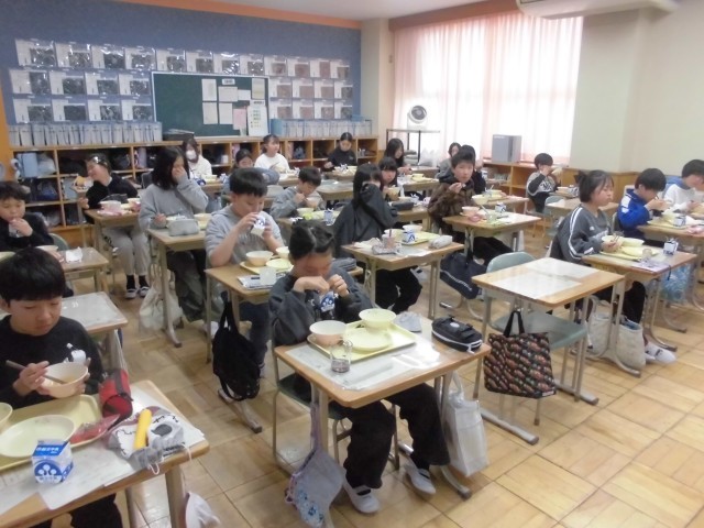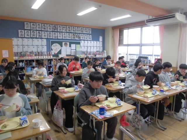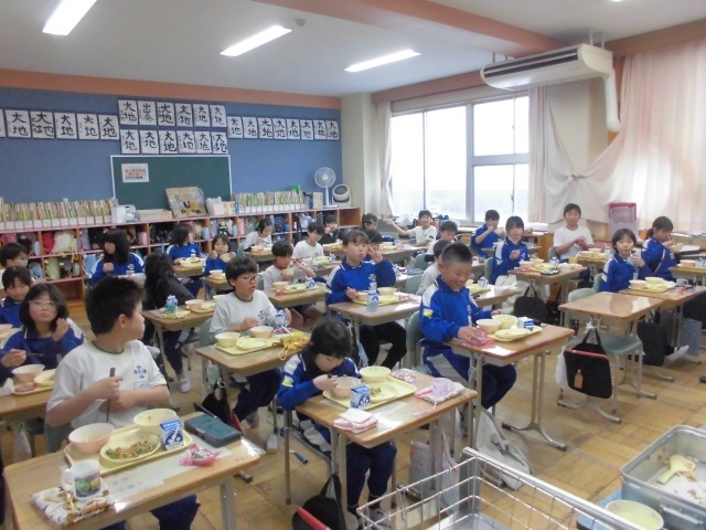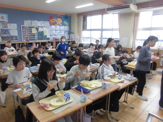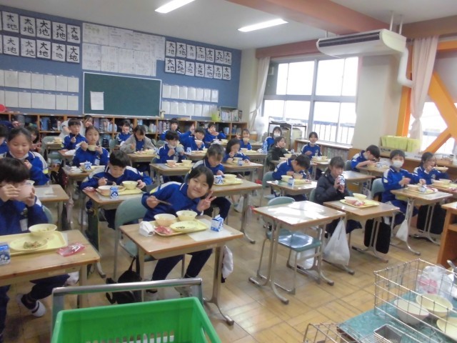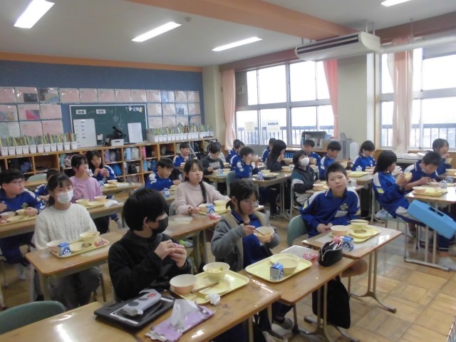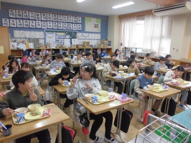 今日は昨日とは打って変わって、真冬に逆戻りの雪の日ではありましたが、子どもたちが朝から楽しみにしていたひな祭り給食です。献立は、ちらしずし、菜の花の和え物、すまし汁、桜もち、牛乳です。春を感じさせる華やかな彩と上品な味わいの給食に、どのクラスもおかわり続出でありました。