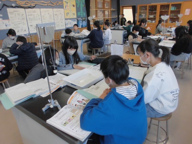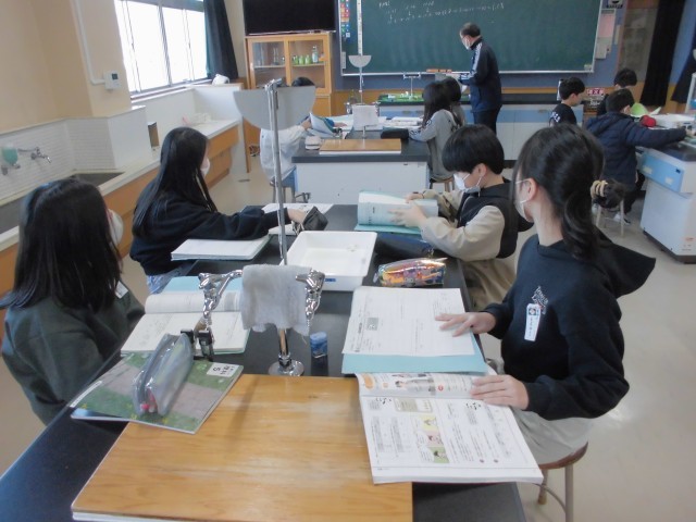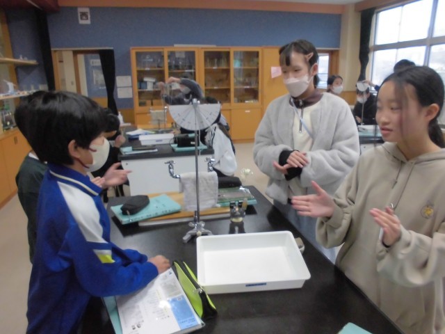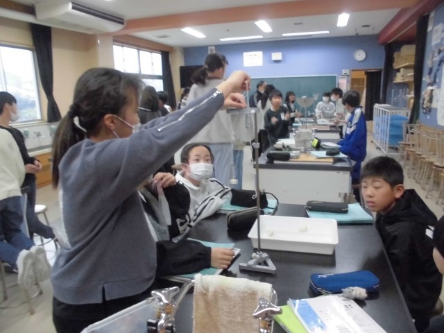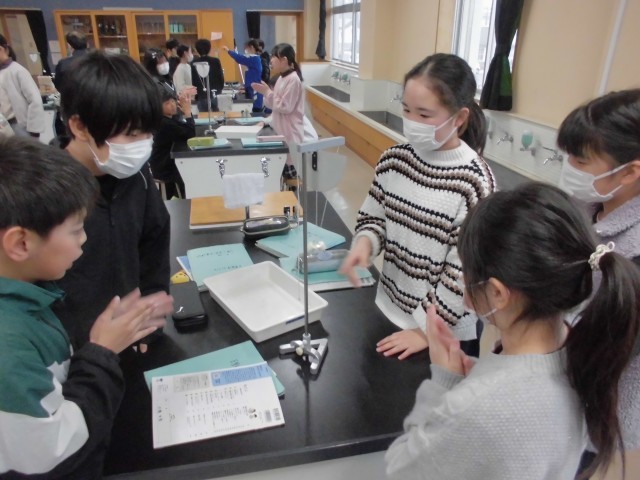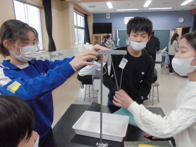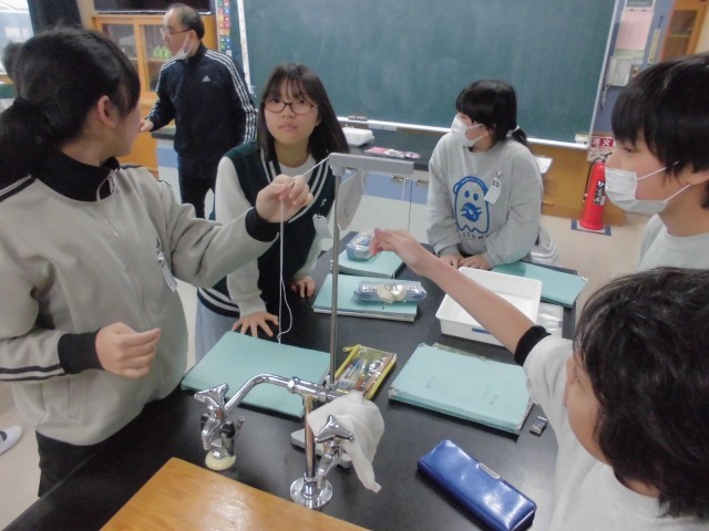 ふりこの長さと、ふりこの一往復する時間の関係を調べる実験を行っています。いろいろなテンポの曲に合わせてふりこの長さを調節しながら、グループごとに協力し合って、運動法則の基礎を探究することができました。
