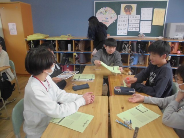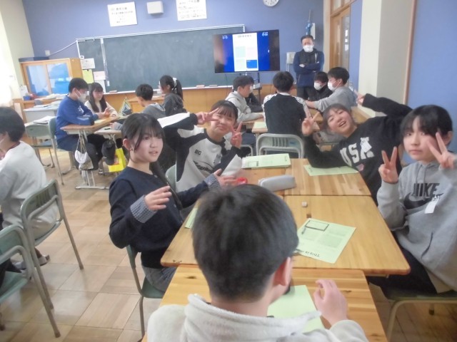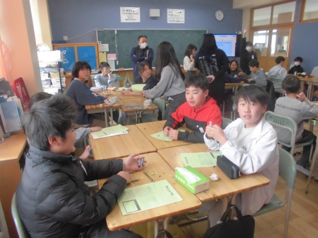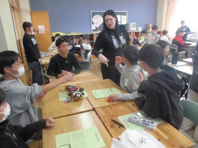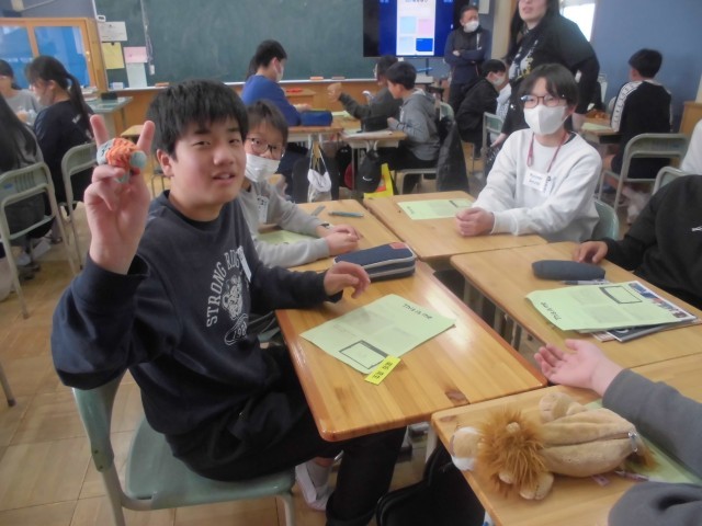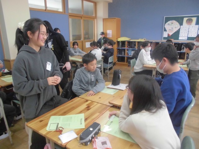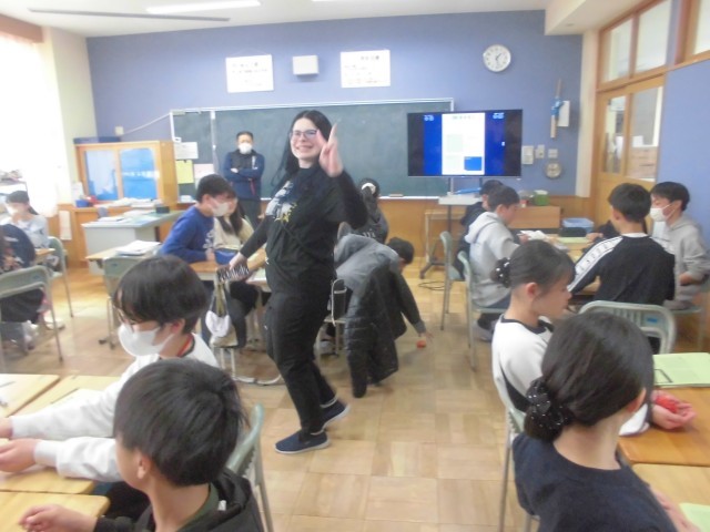 今日はAET(外国人英語講師)ダコタ先生の今年度最後の英語の授業です。6年生は、This is me.(自己紹介)ゲームで盛り上がっておりました。これまで学んできた英会話をフルに活用し、自己紹介します。「好きなこと、好きなもの」、「小学校のいちばんの思い出」、「部活動や中学校生活」、「自分の夢」等、様々な視点から音楽に合わせてお手玉をまわし、順番に英語で自己紹介していきます。中学校でも楽しく英語の勉強ができるといいですね。
