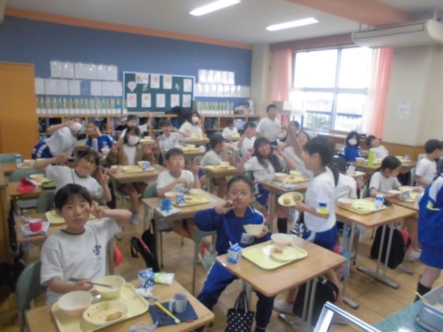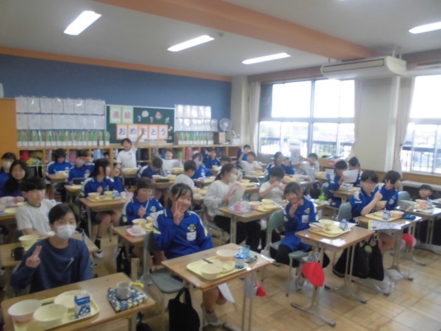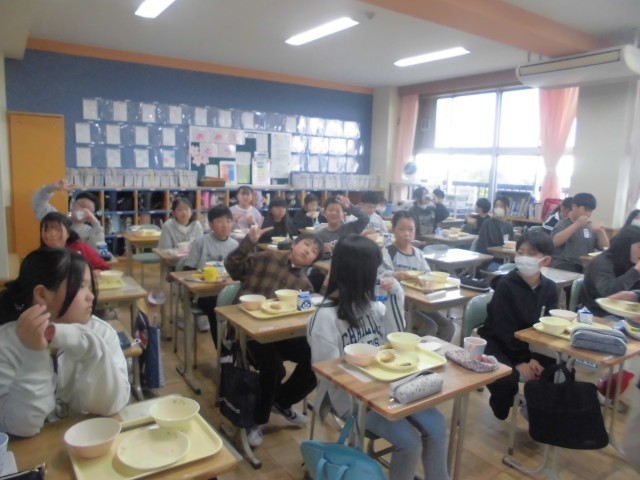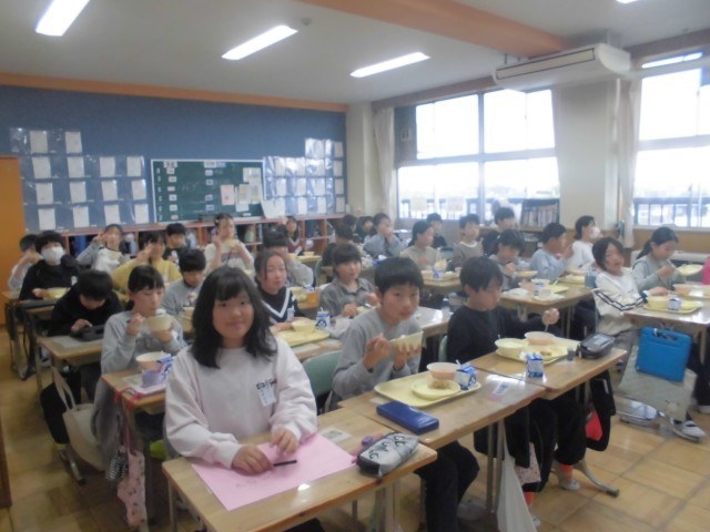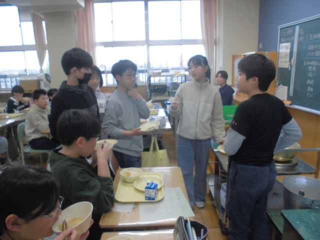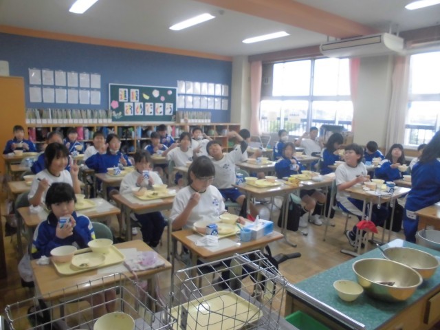 今日の献立は、ごはん、鮭フライ、ゴマ風味和え、南蛮汁、牛乳です。野菜たっぷり具だくさんの南蛮汁は、食べごたえたっぷりで、みんなおかわりしていました。カリカリの鮭フライも好評でした。今日は高学年の給食のようすです。明日は、お弁当の日です。朝早くからお弁当の準備お世話になります。