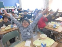 1年1組では、給食の準備がはやくなり、献立を発表してくれる日直さんも上手に伝えることができていました。