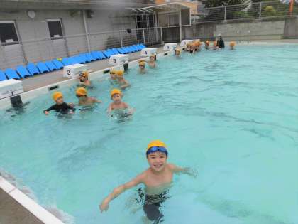 水に慣れ、進んで水中の輪を拾ったり、顔をつけて浮いたりすることができるようになった1年生。今日は授業の最後にみんなで力を合わせて流れるプールを作って楽しみました。