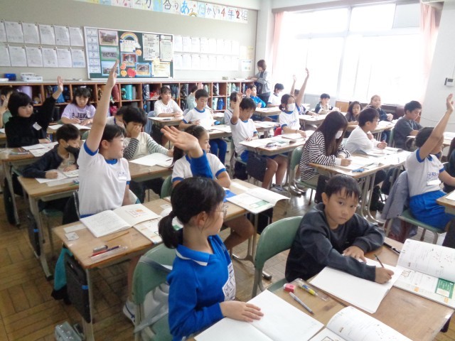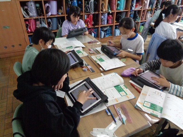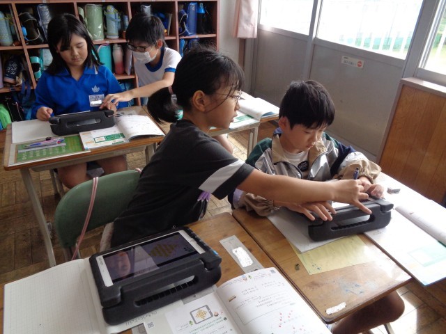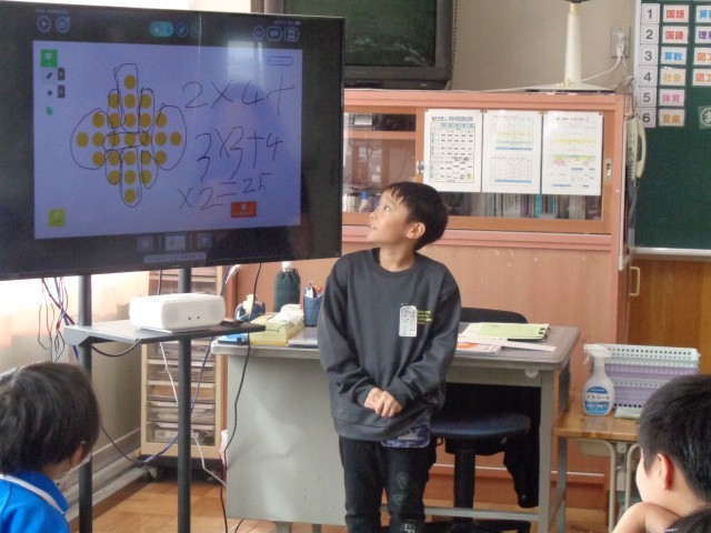 ドットの数の求め方をまとめたり移動させたりするなど工夫をして考え、1つの式に表す授業です。タブレットも難なくこなす子どもたち。一人一人、まとまりを作り立式することができていました。
