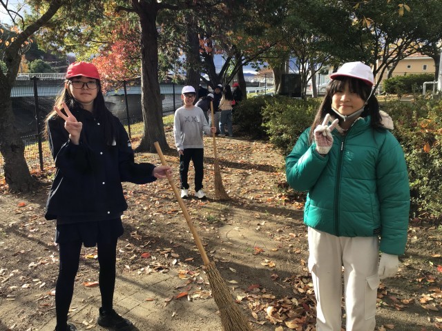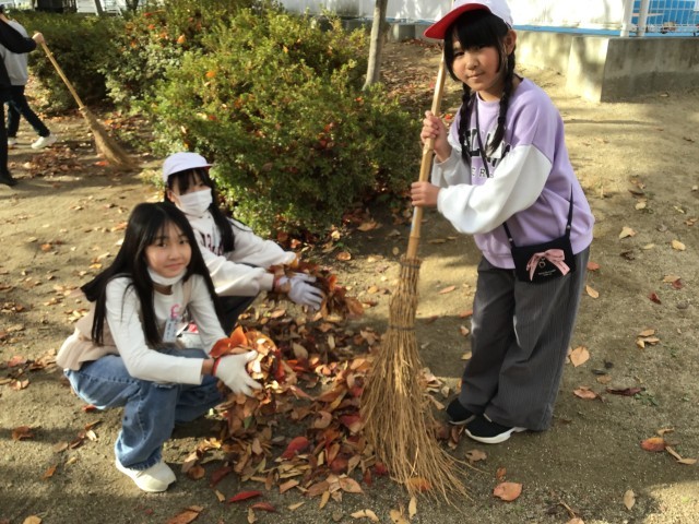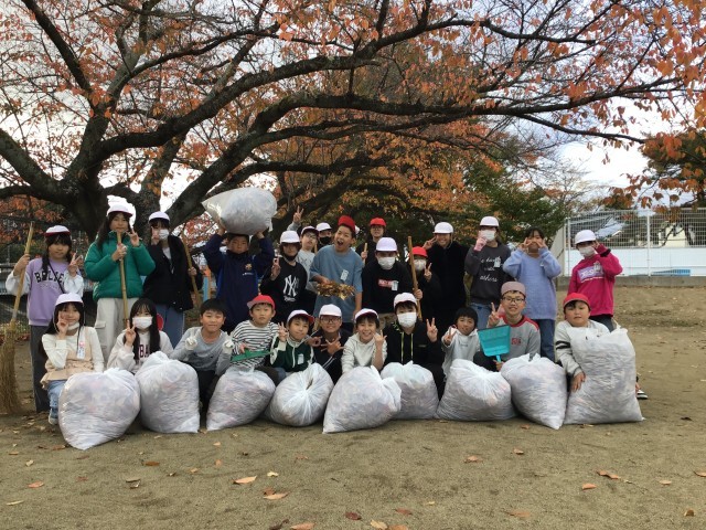 きれいに色づいた桜の葉が、風に吹かれて舞う季節となりました。紅葉が校庭の片隅に溜まってきたので片付けました。約30分で10袋集めることができました。みんな一生懸命に集めた結果です。校庭を見て、またやりたいと意欲満々でした。
