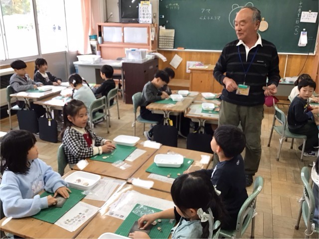 火曜日には、森の案内人の先生方にお越しいただき、間伐材を利用したくまちゃんキーホルダーやブンブンゴマ作りを体験しました。お話をよく聞いて、丁寧に作っていました。