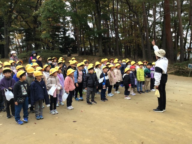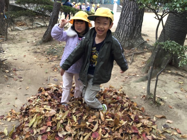 そして本日は成山公園へ歩いてお出かけしました。どんぐりやくり、松ぼっくり、落ち葉を見つけて、思い思いに秋の遊びを楽しんでいました。帰り道には赤く染まったカエデやツタの葉っぱを見つけて、「まっかだな〜♩まっかだな〜♩」と毎朝歌っている「今月の歌」を口ずさむなど、素敵な活動になりました。