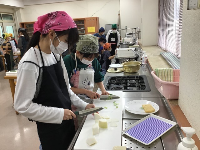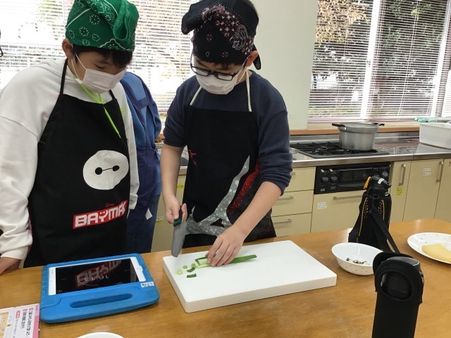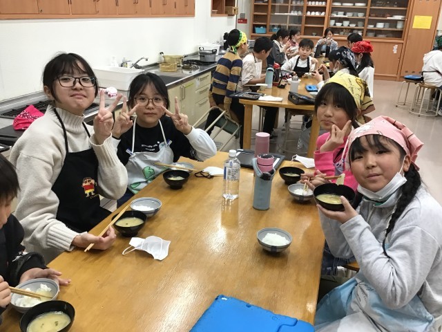 3組の次は、2組が調理実習を行いました。前の時間に学習した手順を慎重に確認しながら作業をする子どもたち。米とぎは、お家でやっているという子もいて、手際の良さを見せていました。ご飯は、火加減を調整して上手に炊けました。味噌汁も絶品だったようで、「またやりたい。」という声がたくさん聞かれました。自分で作ったエプロンを着けて、楽しく実習ができました。