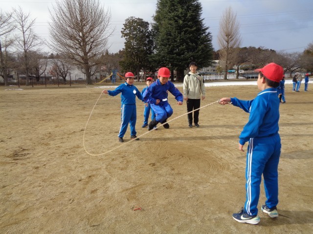 体育科では、寒さにも負けず、みんなで声をかけあいながら長縄跳びに挑戦しました。