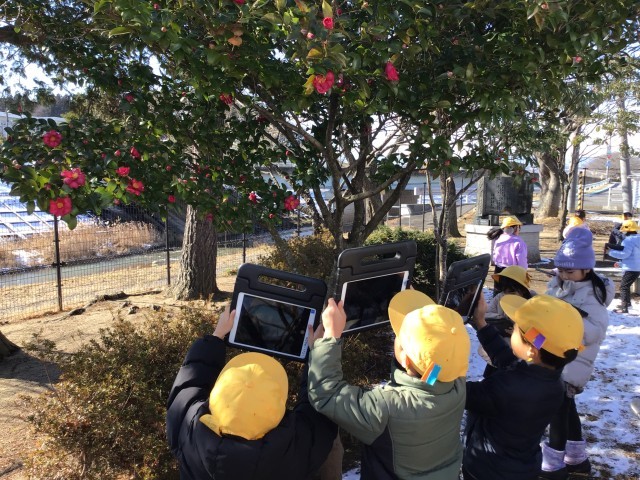 生活科では「冬となかよし」の学習で、校庭に出かけました。「うわあ!プールがカチコチに凍ってるよ!!」「でも、向こうに見える川は凍ってないよ?なんでだろう?」「ほかの木は葉っぱも無くなっちゃったのに、この木だけきれいな赤い花が咲いてるよ!!」などなど、たくさんの発見の宝物が見つかりました。これからの学習も楽しみです。