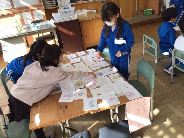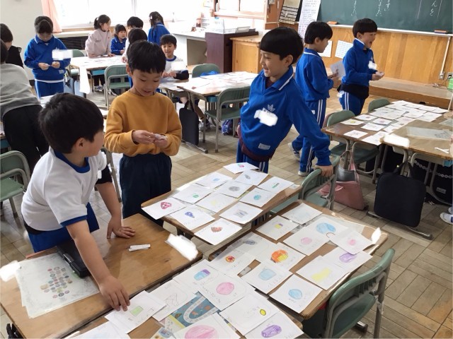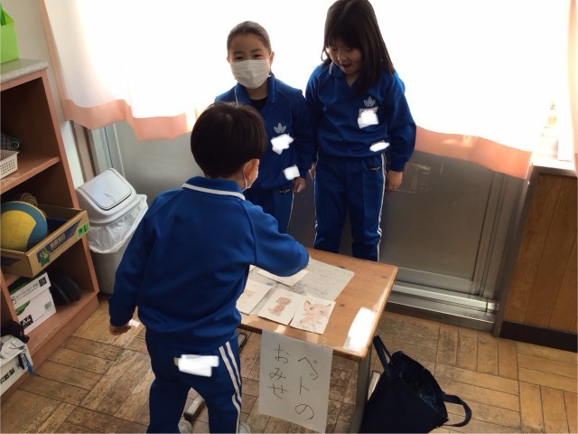 今、国語科では、「もののなまえ」の学習をしています。まとめてつけた名前は「さかな」。一つ一つの名前は「あじ」「さんま」「さば」。ことばのまとまりについて考えた後は、みんなでおみせやさんごっこをしました。文房具屋さんや、お花やさん、宝石店など、工夫して楽しくお買い物ができました。店員さんとお客さんのやり取りを通して、丁寧な言葉遣いについても楽しく考えることができました。