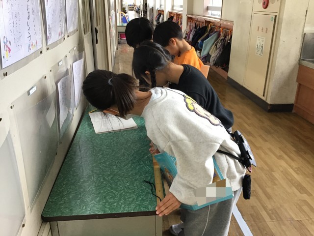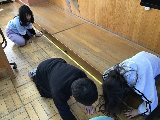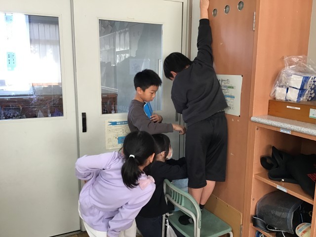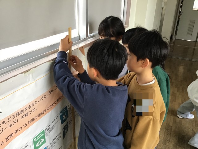 算数の学習で「長いものの長さのたんい」の学習をしました。1mものさしや、自分たちで作った紙テープの3mものさしを使って、教室にあるものや廊下にあるものの長さを測りました。
