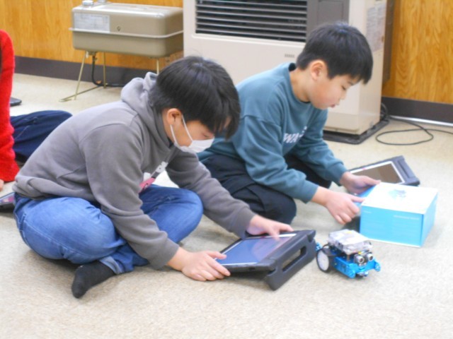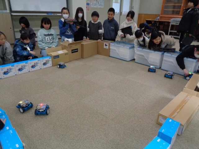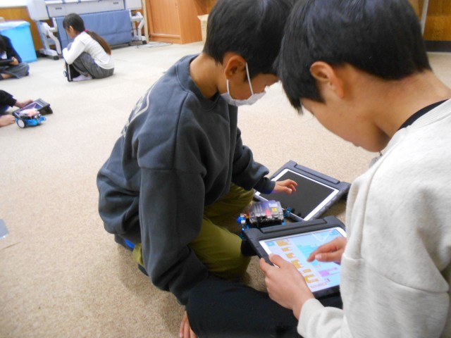 4年生は、「超音波センサー」を理解して、障害物を感知したら止まったり、回避したりするプログラムの学習に取り組みました。