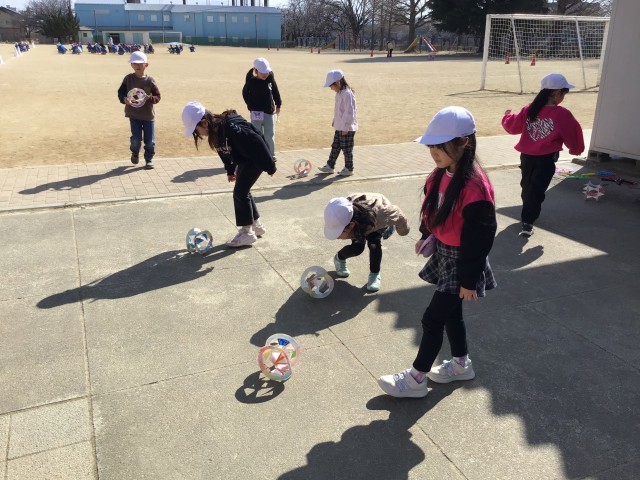 生活科の学習で、「かざわ」というおもちゃを作りました。紙皿を半分に折り、説明動画をよく見て上手に切り込みを入れ、組み合わせました。思い思いに、きれいなもようも付けました。完成したクラスは、さっそく外で転がしてみました。今日は風のない穏やかな天候だったため、少しずつ進む「かざわ」の様子を眺める子どもたちでした。「また北風が戻ってきた日に外に持って行って、かざわと競走しよう!」と計画していました。