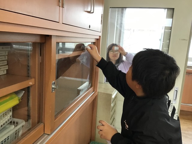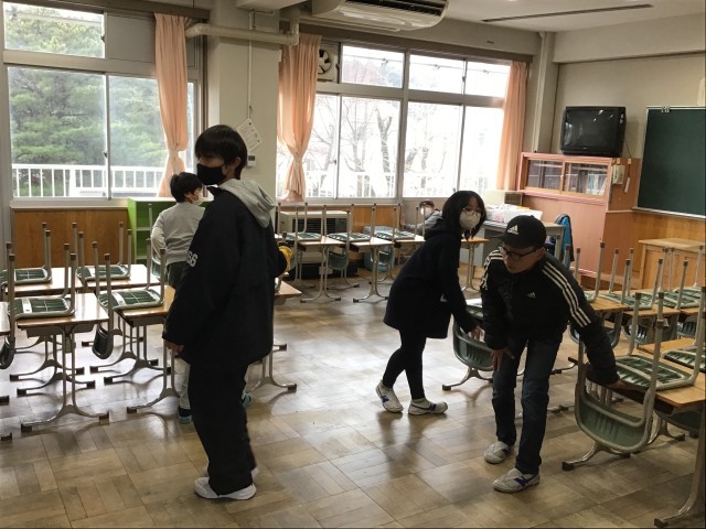 3月26日木曜日に教室移動を行いました。机や椅子を新しい学年の人数分になるように移動しました。それから各教室や廊下、トイレ等のお掃除です。新しい教室で気持ちよく過ごしてほしいと願って、隅々まではいたり、雑巾で丁寧に拭き掃除をしました。みんな本当によくがんばってくれたおかげで、終了予定時刻よりも1時間も早めに終了することができました。テキパキ働く姿は素敵です。最高学年としての自覚が育ってきました。どうもありがとう。きれいな教室で新しい学年をむかえることができます。