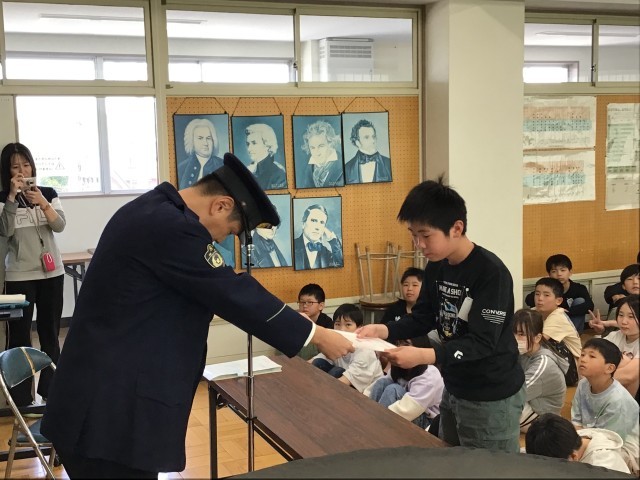 郡山警察署交通課の方をお呼びして、交通安全教室を行いました。6年生は毎年「家庭の交通安全推進員」として警察署から任命され、委任状をいただいています。代表児童が誓いの言葉を読み上げ、委任状を受け取りました。警察署の方からは、道路の歩行の仕方や自転車の乗り方、自動車でのシートベルト着用について再確認してほしいとのお話をいただきました。今日から「家庭の交通安全推進員」として、家族の安全を呼びかける役目を意識してほしいと思います。