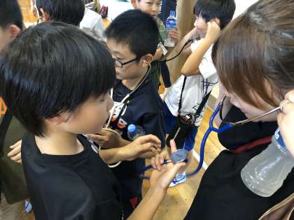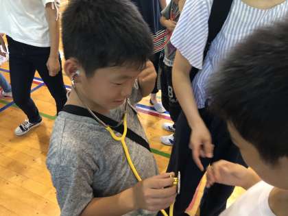 「心臓のドックンドックン聞こえる?」お友達同士でペアになったり、お母さんとペアになったりして、聴診器を胸に当てていました。