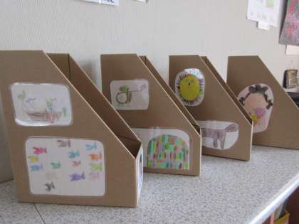 「マイボックス」は、自分の好きな絵を描いて、ラミネート加工し、ボックス側面に貼り付けました。