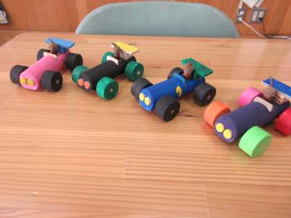 「レーシングカー」は、木材に色付けをし、組み立てました。接着や金づちでのはめ込みを頑張りました!