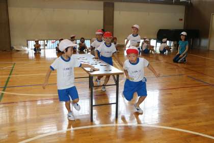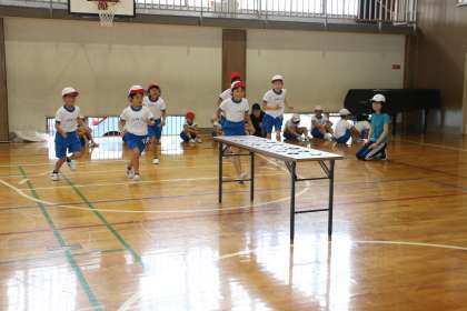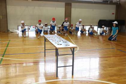 明日の合同体育祭の種目「ドラえもん、どらやきどうぞ」の練習の様子です。