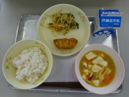 11日の給食は、麦ごはん、牛乳、揚げ餃子、もやしのラー油和え、ジャジャン豆腐でした。