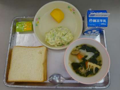 12日の給食は、食パン、はちみつ&マーガリン、牛乳、ポテトサラダ、ワンタンスープ、柿でした。「柿」の種類は、「甘柿」と「渋柿」の大きく2種類に分けられます。「甘柿」は、そのまま食べられますが、「渋柿」は、お酒などのアルコールを吹きかけて、「タンニン」と呼ばれる渋みを抜いて食べます。今日の柿は、福島県産の「平種無し柿」という「渋柿」です。種がないこと、そして程よい甘みと食感が特徴ですよ。