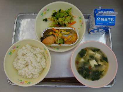 13日の給食は、麦ごはん、牛乳、鮭のちゃんちゃん焼き、青菜の辛し和え、なめこ汁でした。