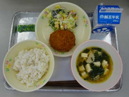 14日の給食は、麦ごはん、牛乳、ごぼうメンチカツ、ハム入りみそマヨネーズ和え、すまし汁でした。「とうもろこし」は、南アメリカの「アンデス」というところで、最初につくられたと言われています。「アンデス」では、とうもろこしを、「ごはん」や「パン」と同じように、「主食」として食べているそうです。それは、「とうもろこし」に、糖分が多く含まれているためです。日本では、茹でて食べたり、「サラダ」や「スープ」などの料理に使われます。給食でもよく登場しますが、「とうもろこし」が入ると甘みが出て、おいしいさが増しますよ。