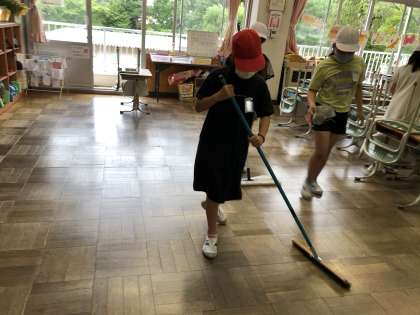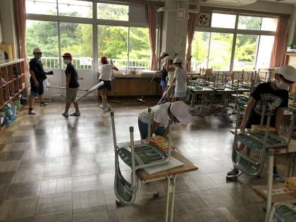 進み具合を見ながら、ほうきではいたり、モップでふいたり、机を運んだりしていました。